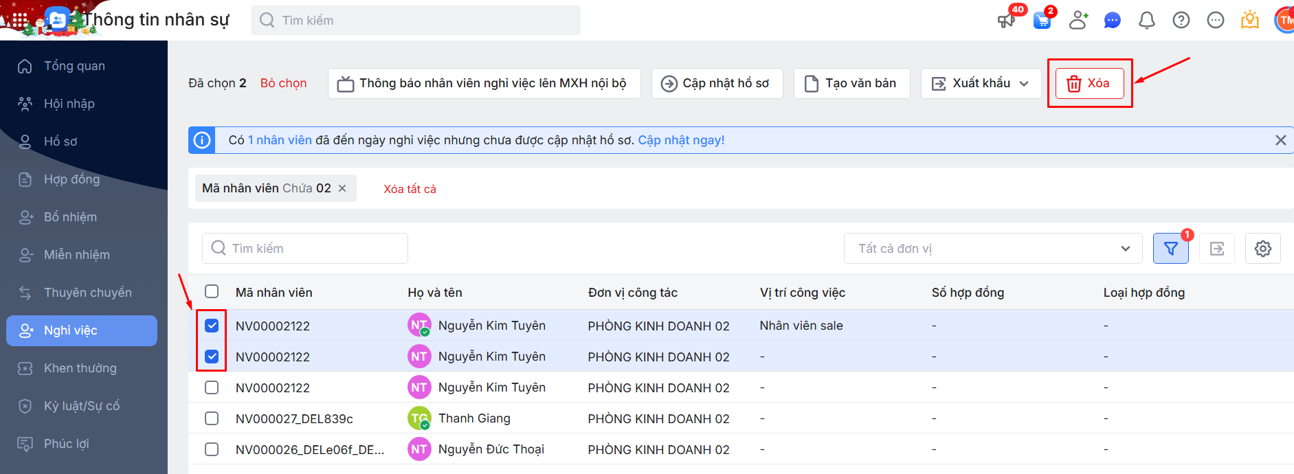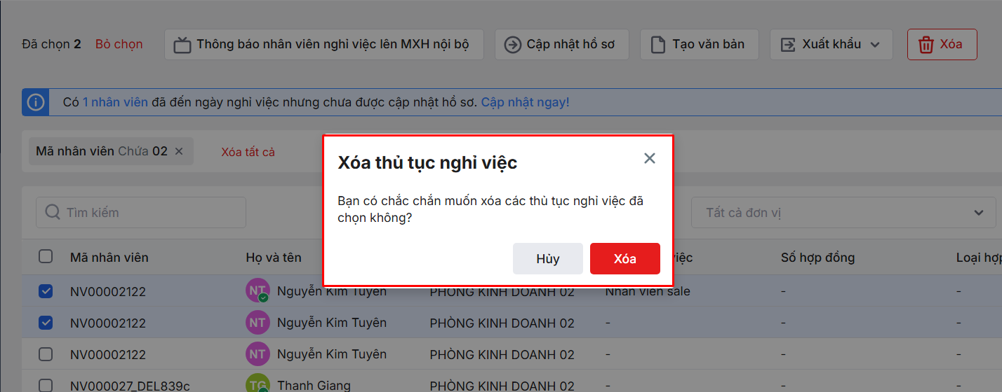 2.7. Xóa thủ tục Nghỉ việc