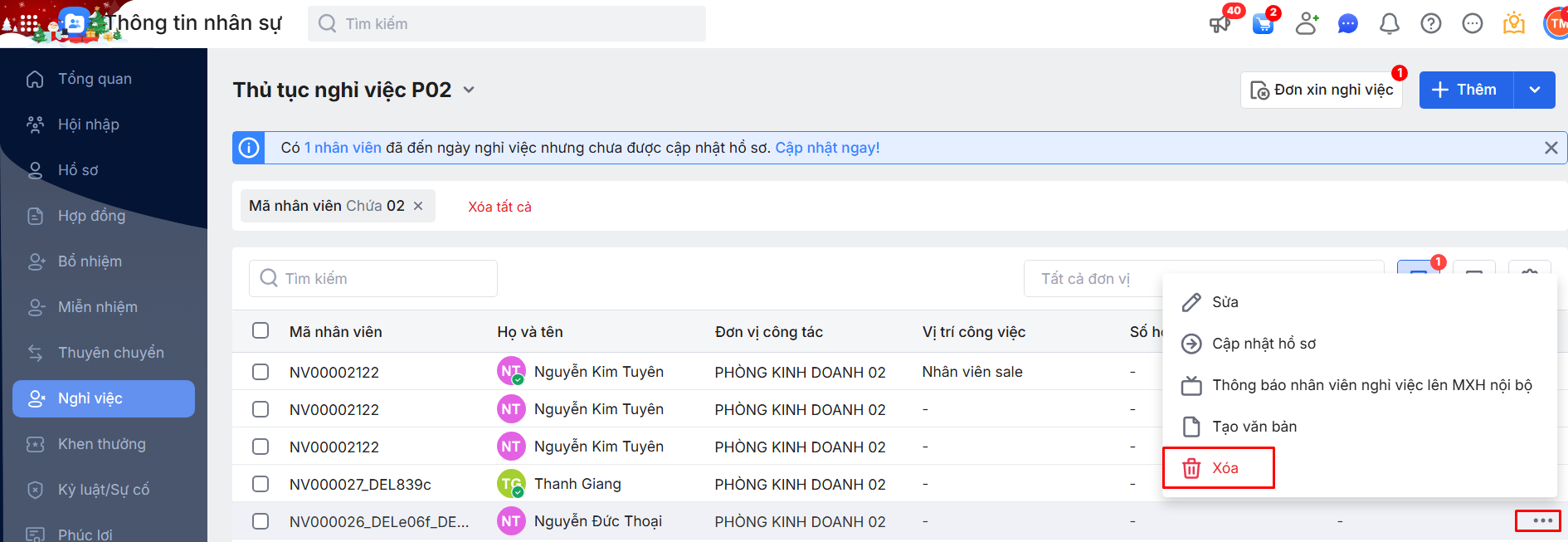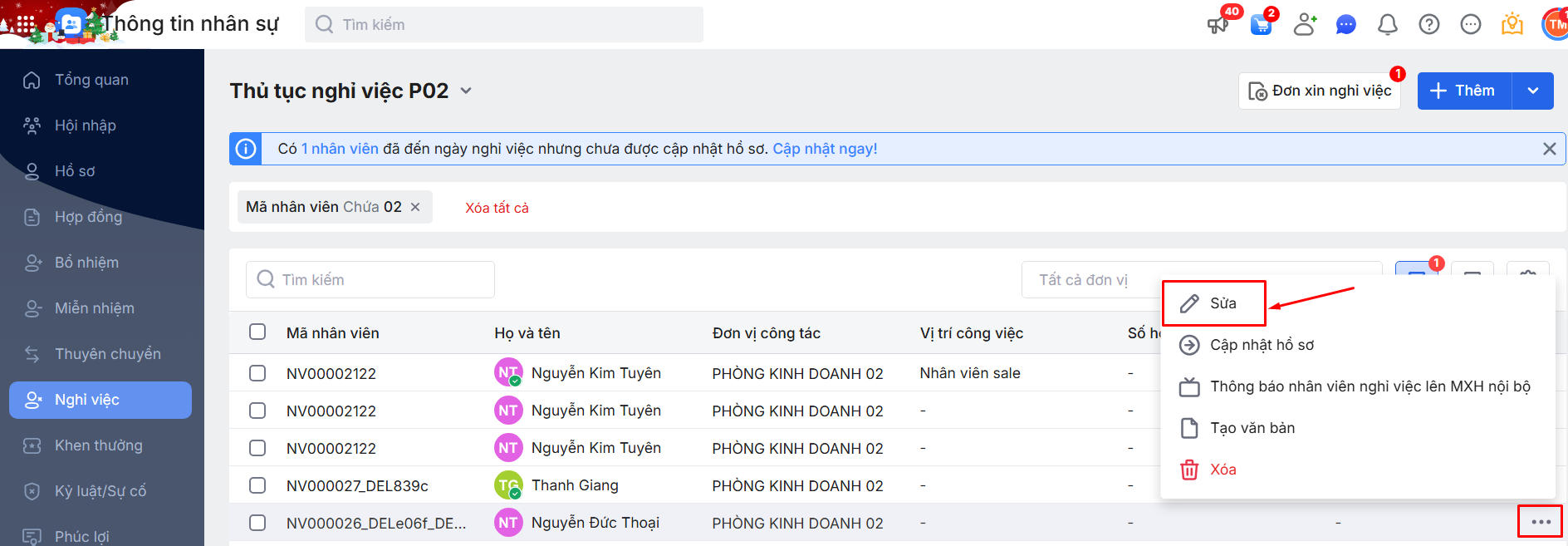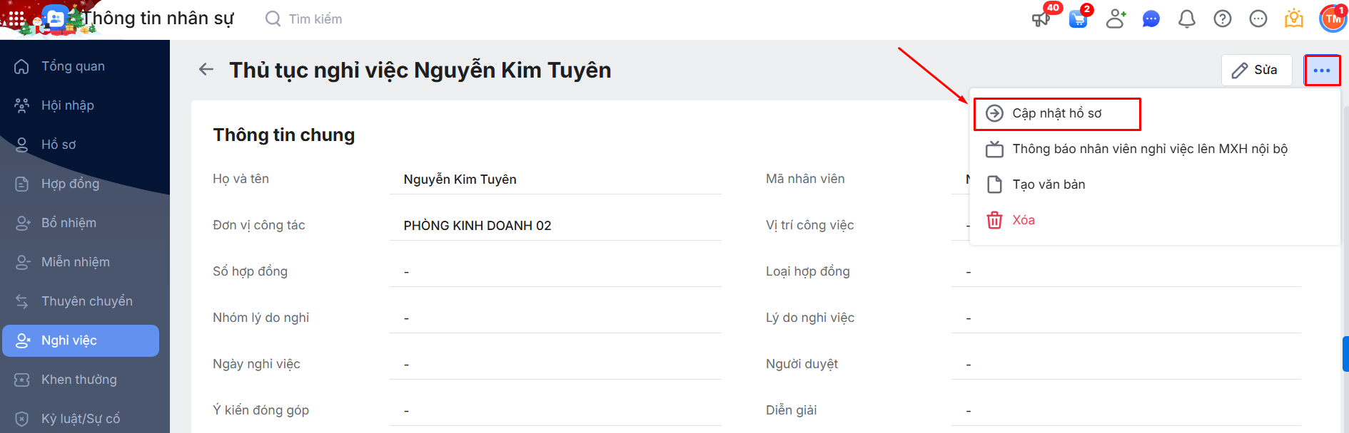 Hoặc nhấn vào 1 bản ghi thủ tục Nghỉ việc để cập nhật thông tin cho từng bản ghi bằng cách nhấn vào biểu tượng dấu ba chấm