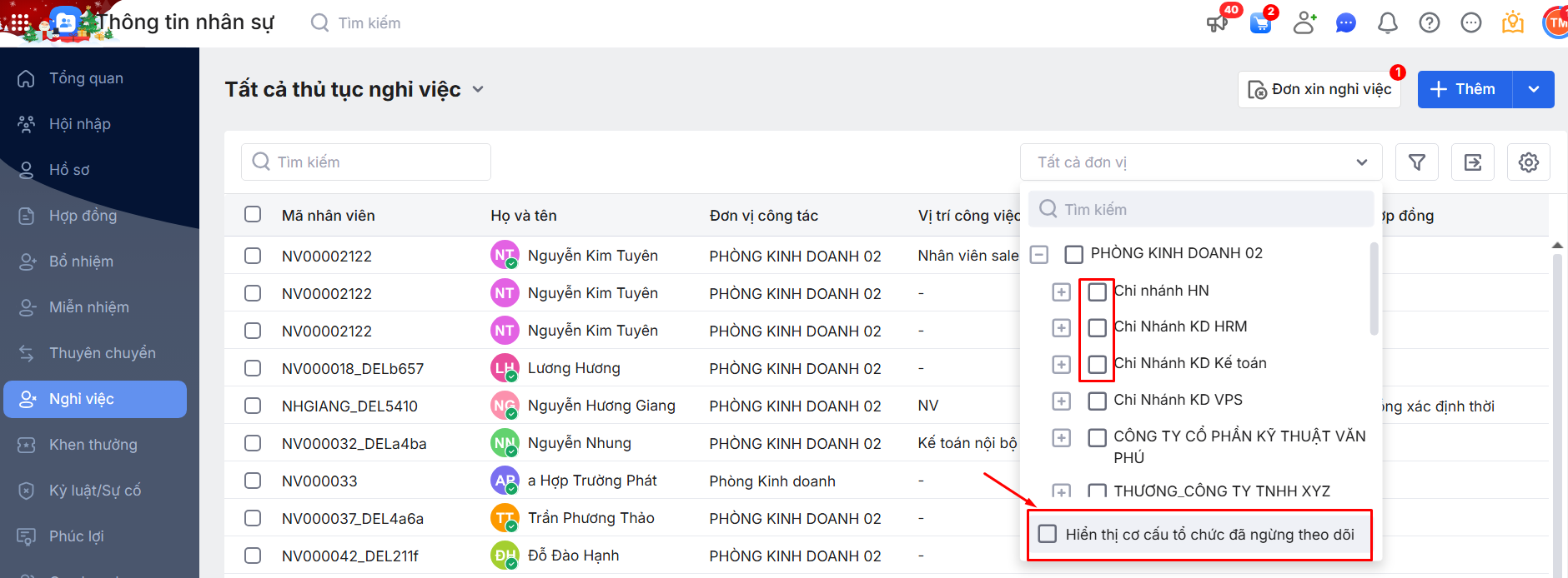 2.2.1. Lọc danh sách thủ tục Nghỉ việc theo cơ cấu tổ chức