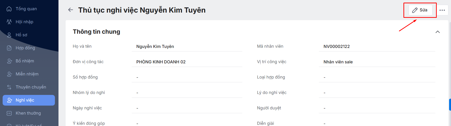 Hoặc Nhấn vào một thủ tục Nghỉ việc chi tiết\ Chọn chức năng Sửa.