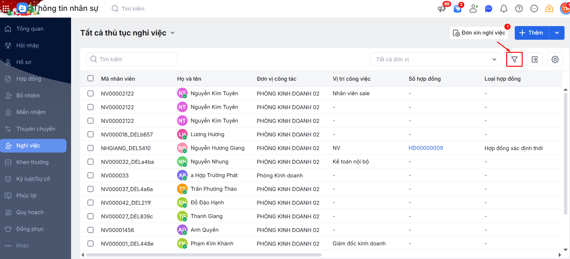 Bước 1: Vào phân hệ Nghỉ việc\ Nhấn vào biểu tượng cái phễu