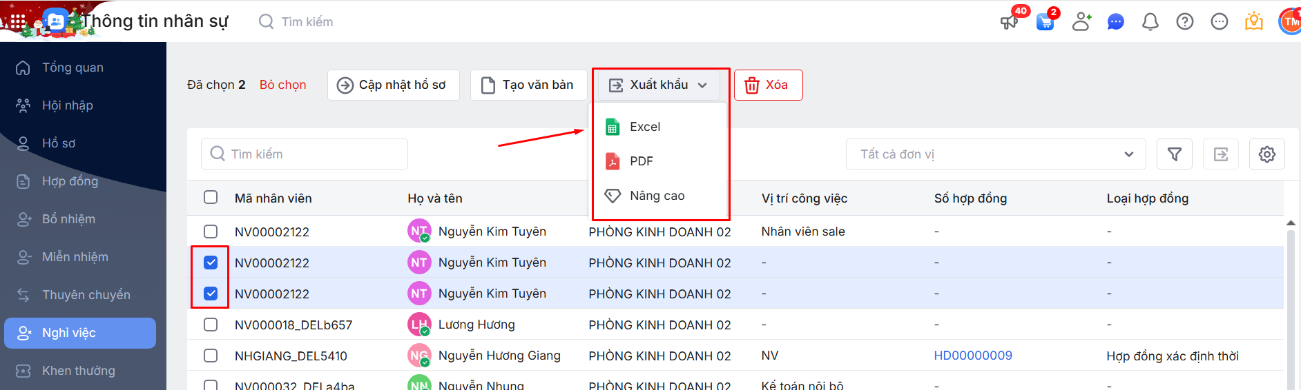 Xuất khẩu một số thủ tục Nghỉ việc của nhân viên trên danh sách:
