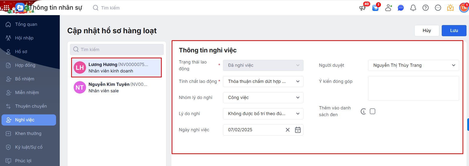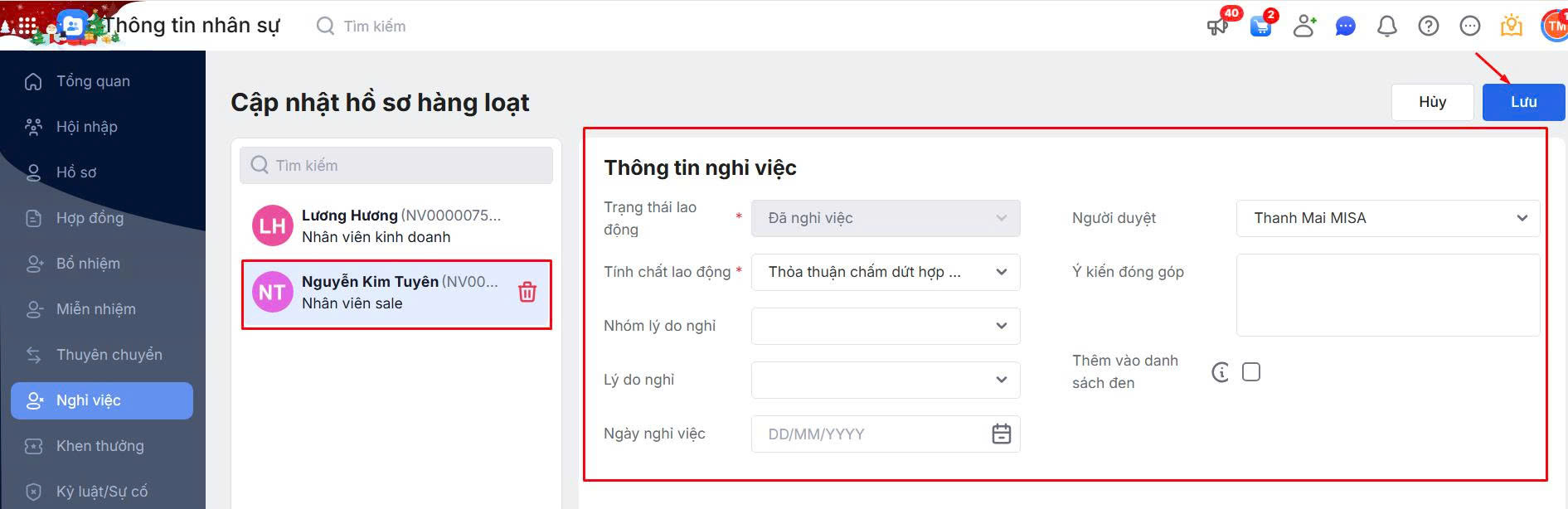 2.5. Cập nhật hồ sơ hàng loạt thủ tục Nghỉ việc