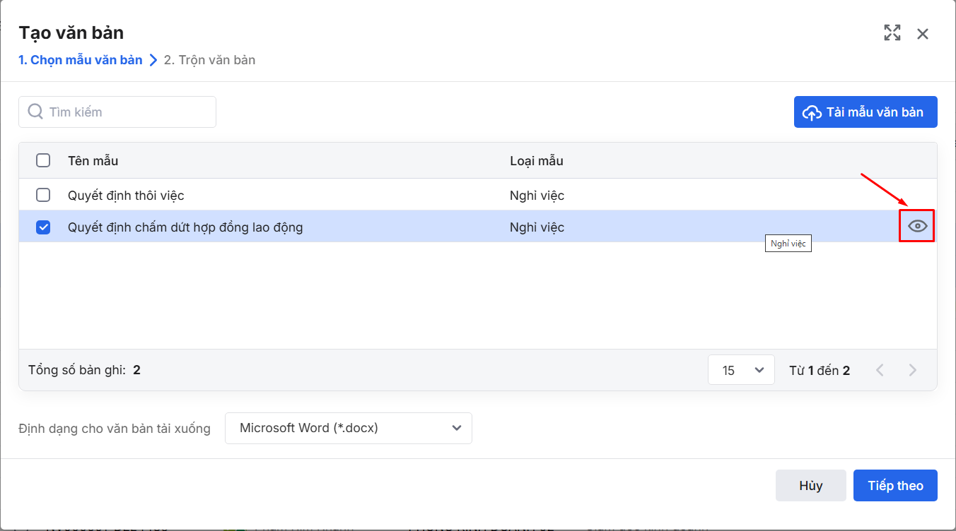 Bước 2: Tích chọn mẫu để trộn tạo văn bản (Xem hướng dẫn thiết lập mẫu tạo văn bản tại đây)\ Di chuột vào tên mẫu nhấn vào biểu tượng con mắt
