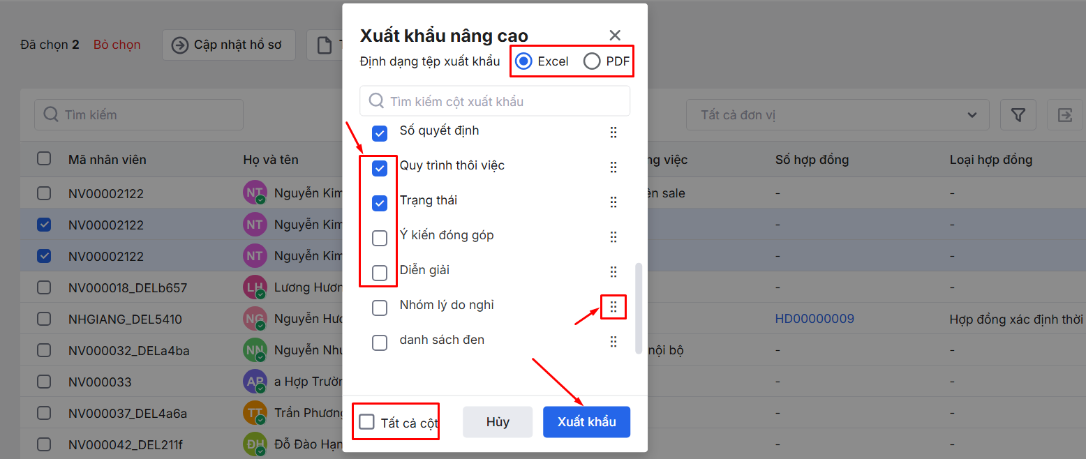 Bước 2: Để tùy chỉnh cột\ Nhấn chọn nâng cao\ Chọn định dạng file xuất\ Tích chọn các cột thông tin muốn xuất ra\ Nhấn vào biểu tượng dấu sáu chấm cuối mỗi cột thông tin để di chuyển và sắp xếp vị trí muốn hiển thị trên file xuất ra.