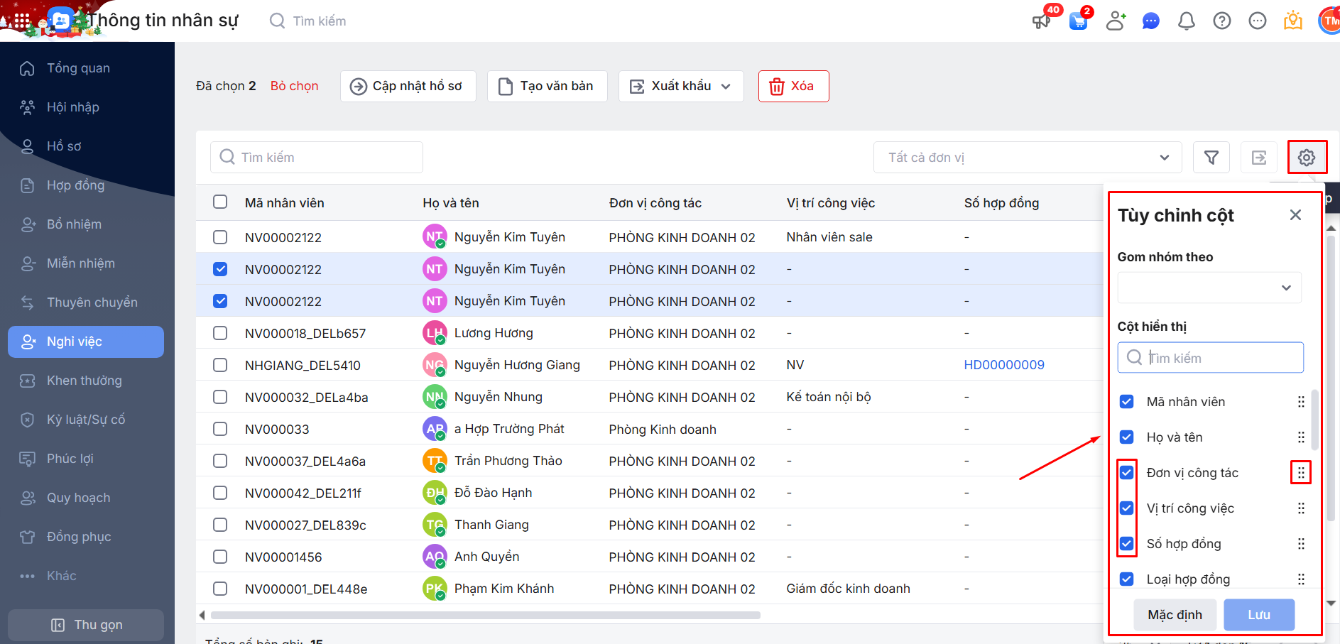 2.4. Tùy chỉnh cột hiển thị trên danh sách thủ tục Nghỉ việc