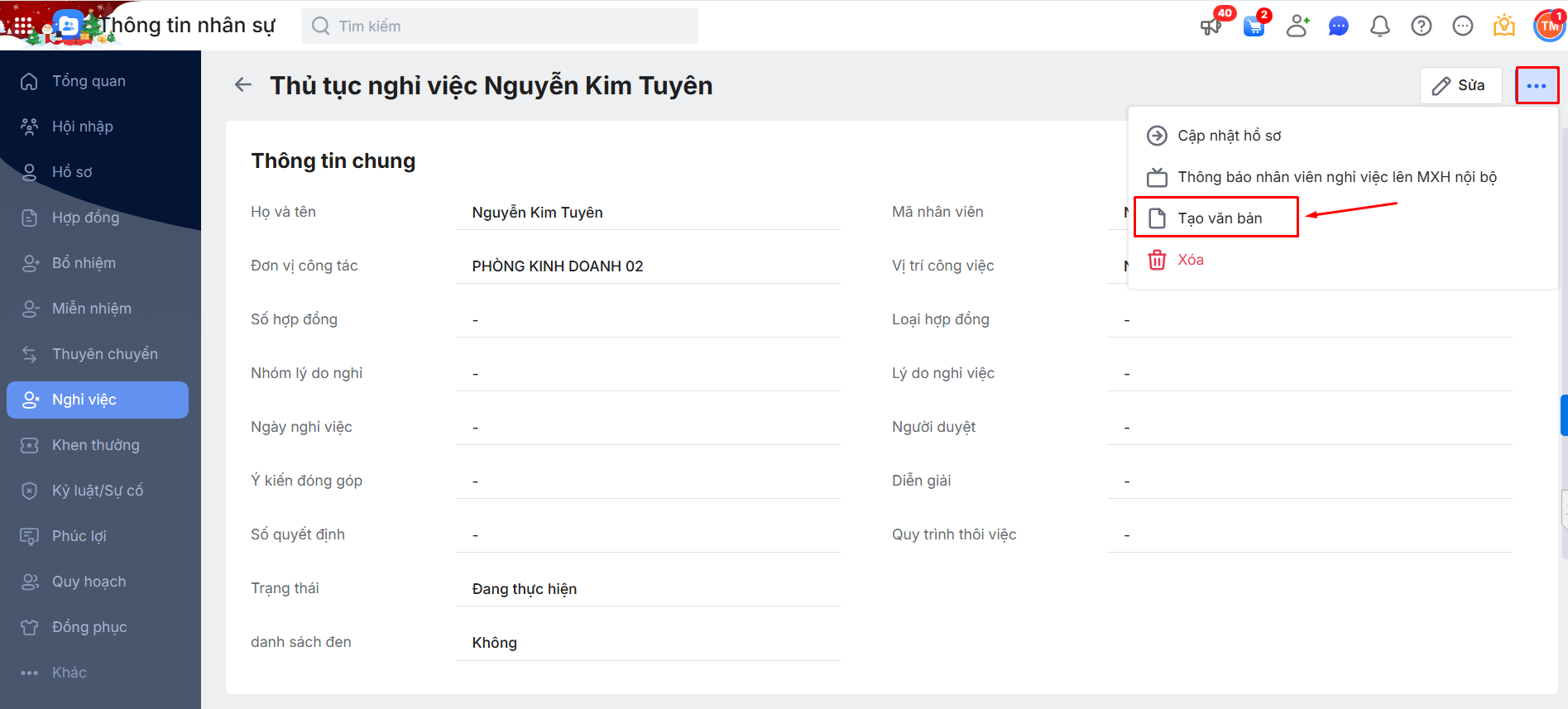 Hoặc nhấn vào 1 bản ghi thủ tục Nghỉ việc chi tiết để Tạo văn bản cho riêng thủ tục Nghỉ việc bằng cách nhấn vào biểu tượng dấu ba chấm
