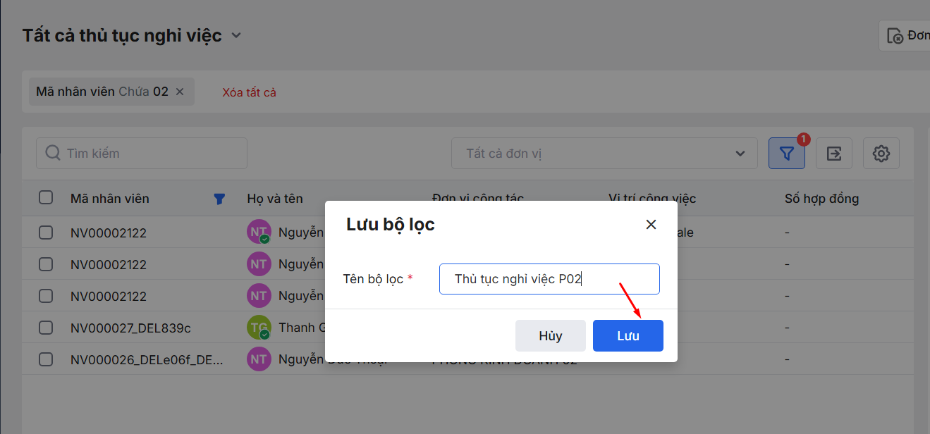 2.2.2. Tạo bộ lọc danh sách thủ tục Nghỉ việc theo các trường thông tin cụ thể
