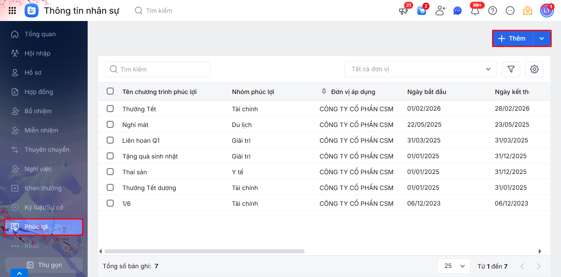 Bước 1: Trên phân hệ Phúc lợi \ nhấn Thêm