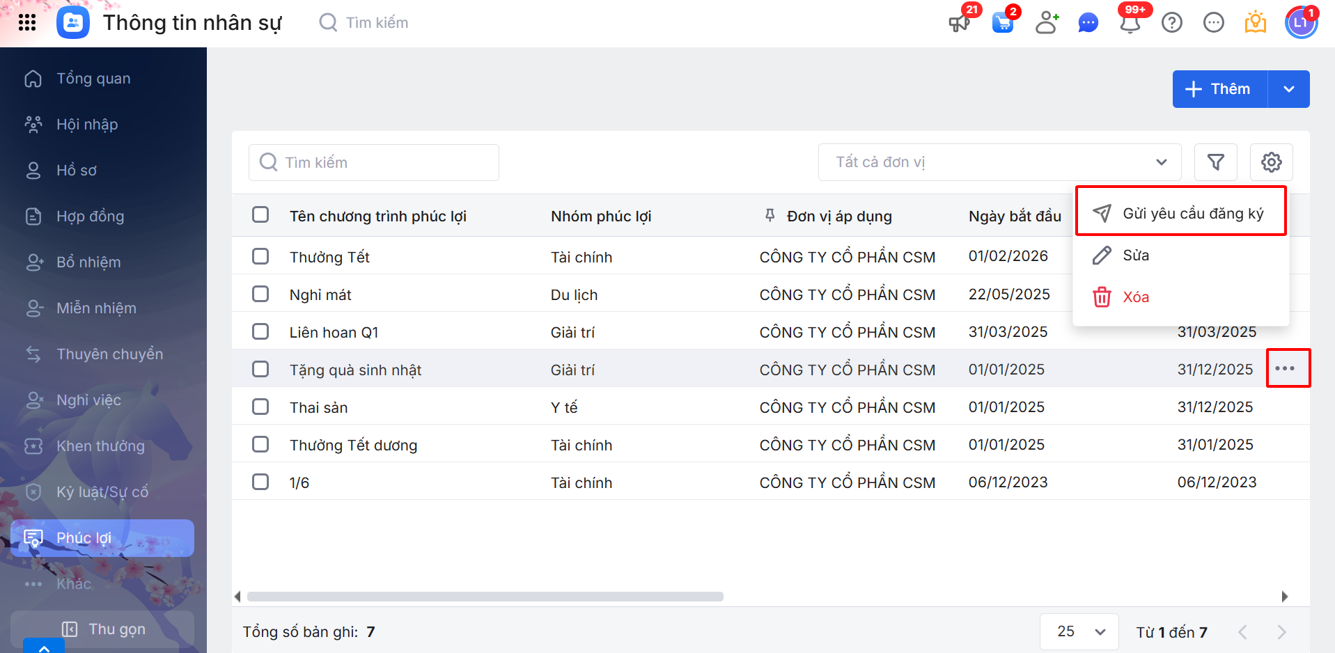 Giúp HR ghi nhận thông tin của các chương trình phúc lợi mà công ty cổ chức và gửi yêu cầu đăng ký cho nhân viên.