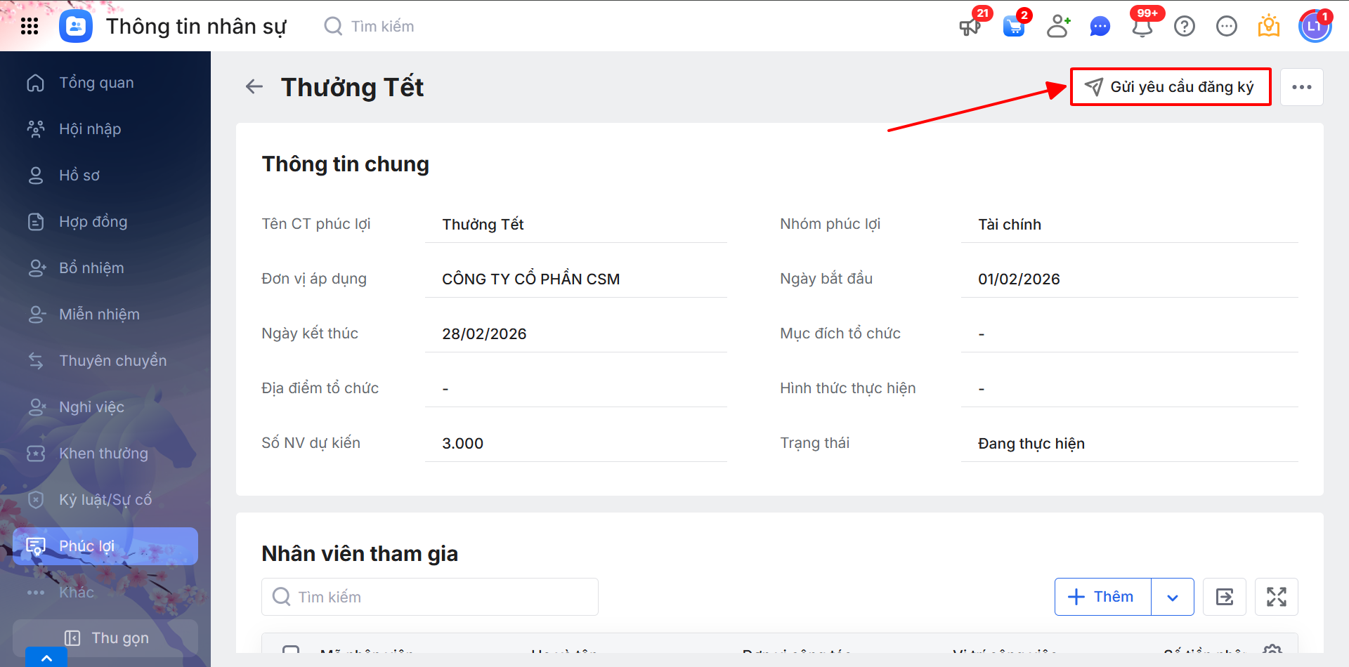 - Hoặc, tại chi tiết bản ghi Phúc lợi, nhấn Gửi yêu cầu đăng ký