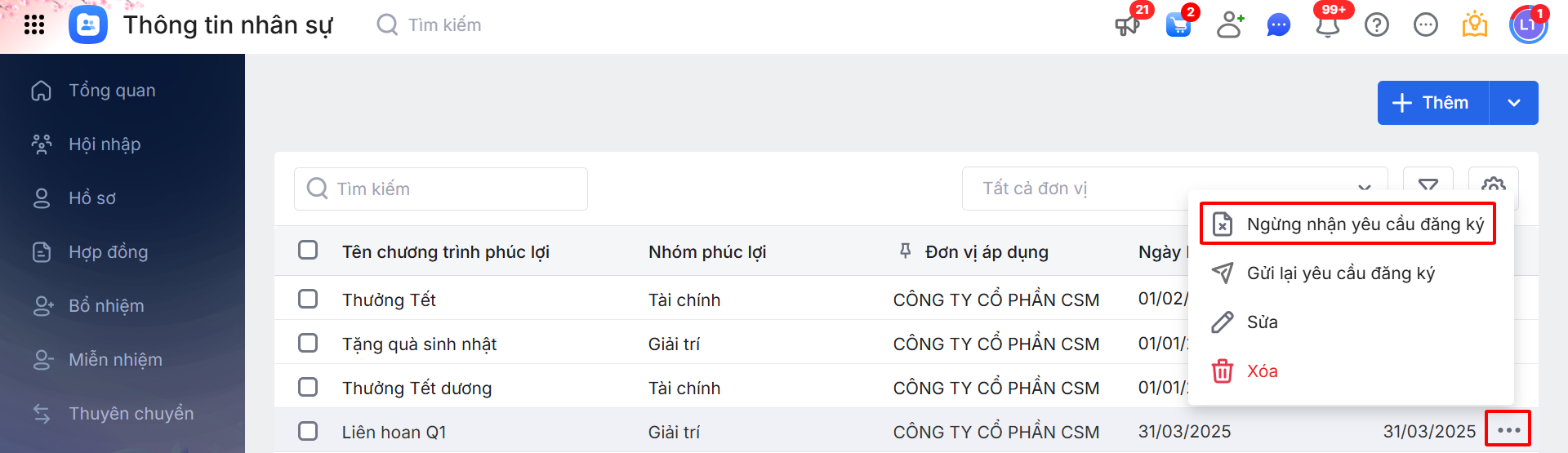 Bước 4: Trong trường hợp cần thiết, HR có thể tùy chọn Ngừng nhận yêu cầu đăng ký: di chuột vào bản ghi Phúc lợi \ nhấn biểu tượng ba chấm … \ chọn Ngừng nhận yêu cầu đăng ký.