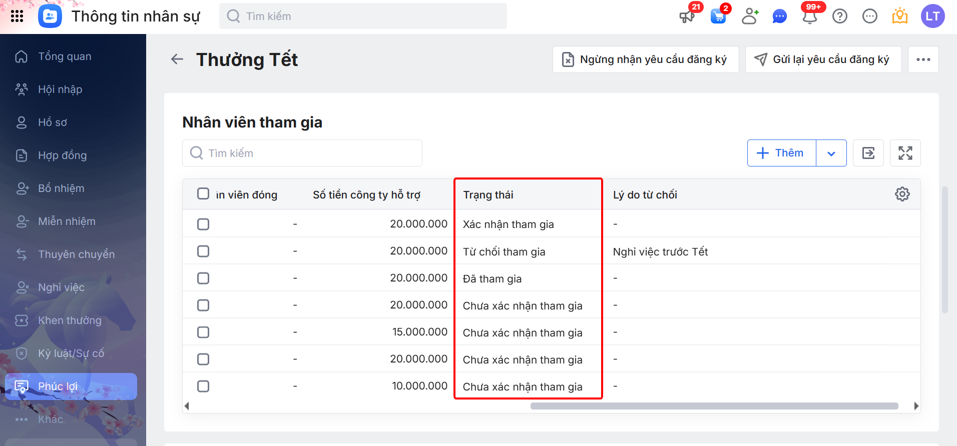 Sau khi nhân viên xác nhận tham gia chương trình phúc lợi, chương trình sẽ cập nhật tình trạng trên danh sách nhân viên tham gia để HR tiện nắm được.