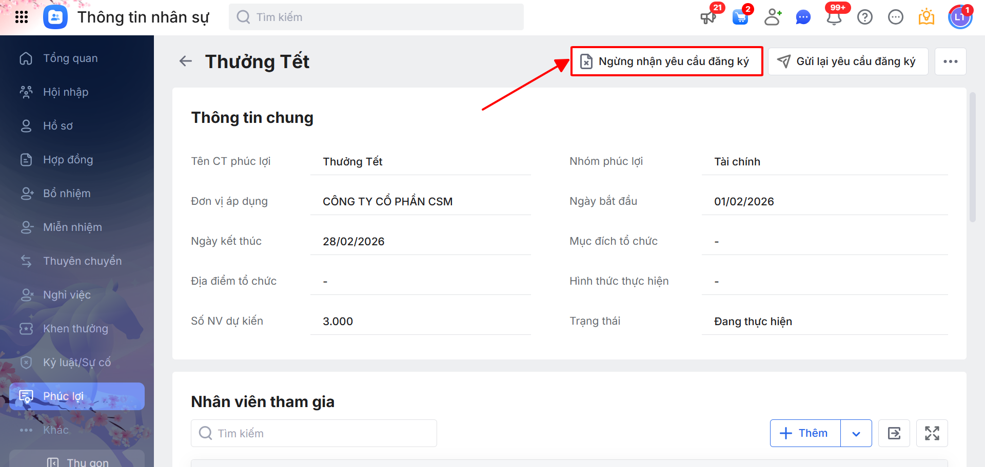 - Hoặc, vào chi tiết bản ghi Phúc lợi \ chọn Ngừng nhận yêu cầu đăng ký.