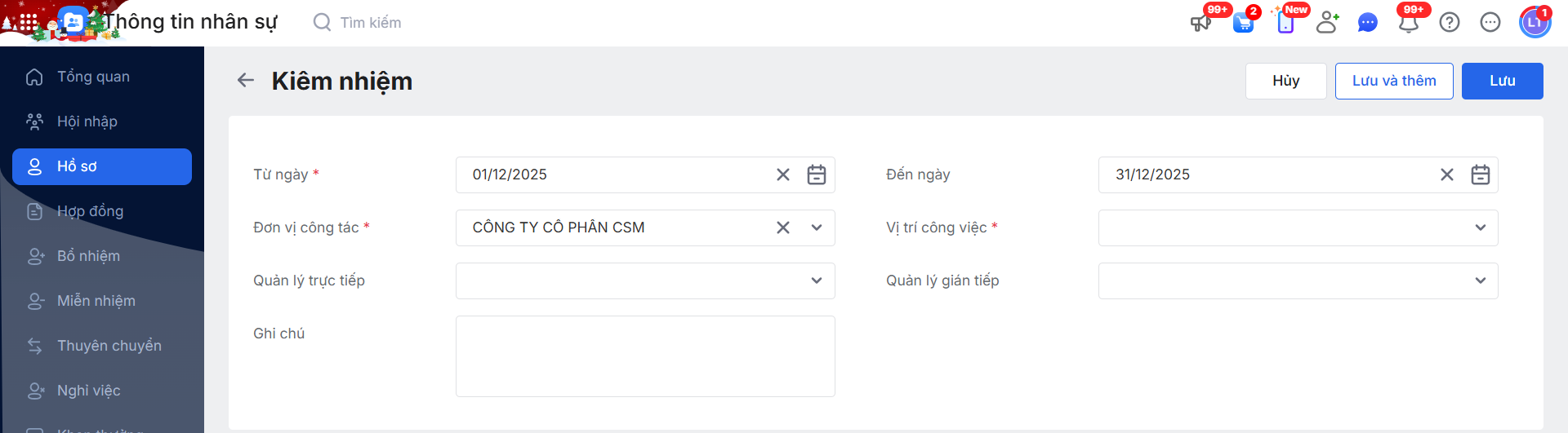 Bước 3: Điền thông tin sau đó nhấn Lưu để lưu vị trí Kiêm nhiệm