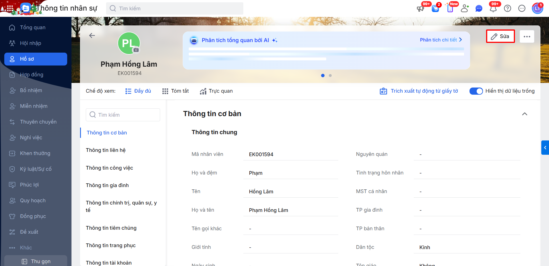 Bước 1: Vào phân hệ Hồ sơ \ chi tiết Hồ sơ \ nhấn Sửa