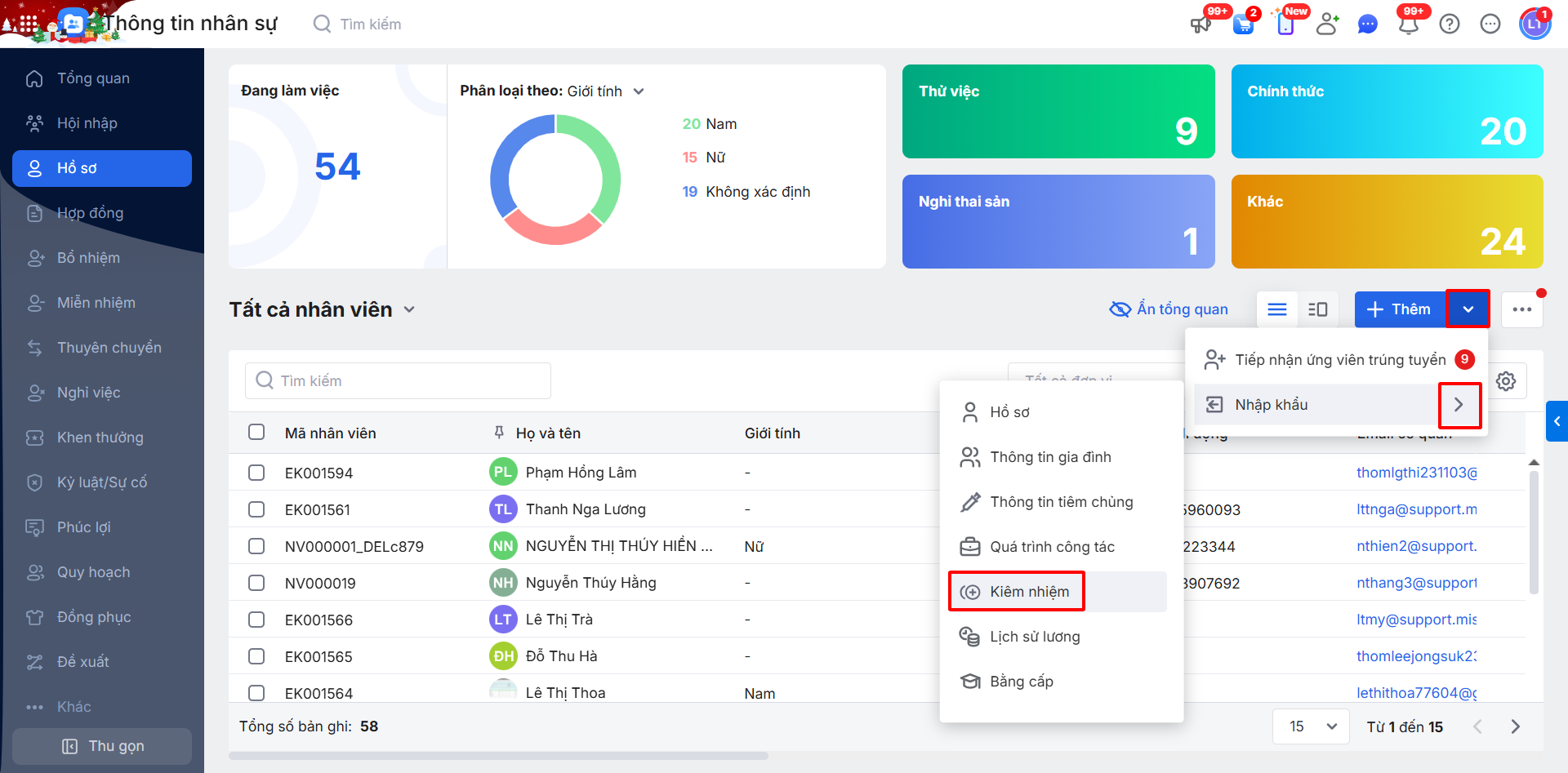 Bước 1: Trên phân hệ Hồ sơ \ nhấn biểu tượng mũi tên xuống ⏷\ chọn Nhập khẩu \ sau đó chọn Kiêm nhiệm