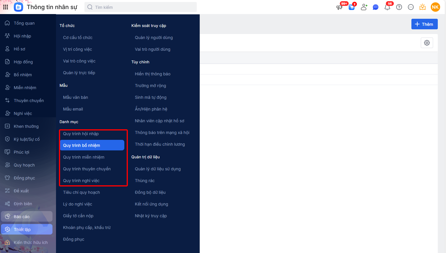Danh mục quy trình và danh sách công việc cần thực hiện khai báo tại đây sẽ được sử dụng để ghi nhận nhanh vào các thủ tục tại phân hệ Bổ nhiệm, Miễn nhiệm, Thuyên chuyển, Nghỉ việc tương ứng.