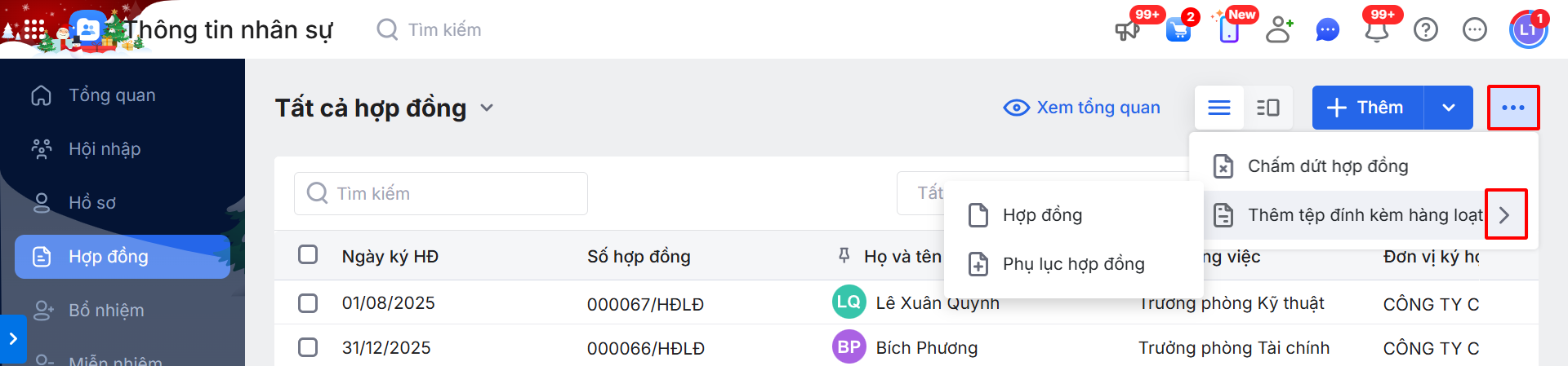 Bước 1: Tại phân hệ Hợp đồng \ nhấn biểu tượng dấu ba chấm … \ nhấn Thêm tệp đính kèm hàng loạt \ chọn loại Hợp đồng/Phụ lục hợp đồng.