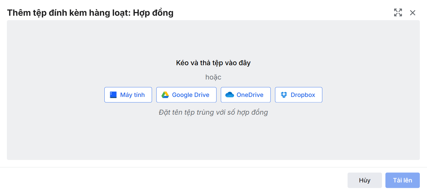 Lưu ý: Đặt sẵn tên tệp trùng với số hợp đồng/phụ lục hợp đồng để ghép được file với bản ghi trên phần mềm.