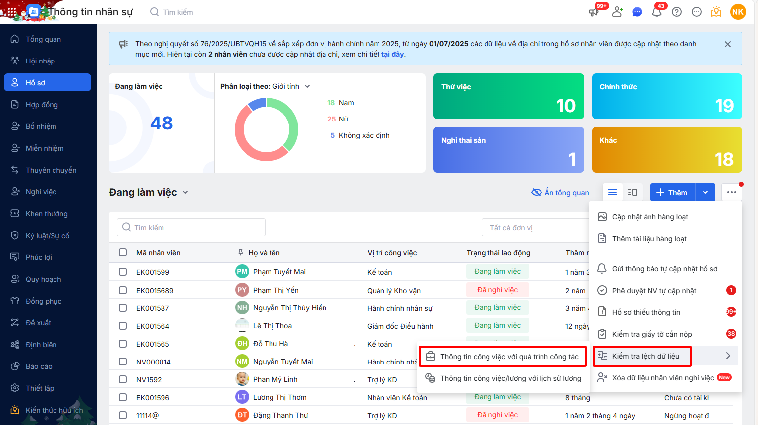 Bước 1: Tại phân hệ Hồ sơ, nhấn vào biểu tượng và chọn Kiểm tra lệch dữ liệu\Thông tin công việc với quá trình công tác.