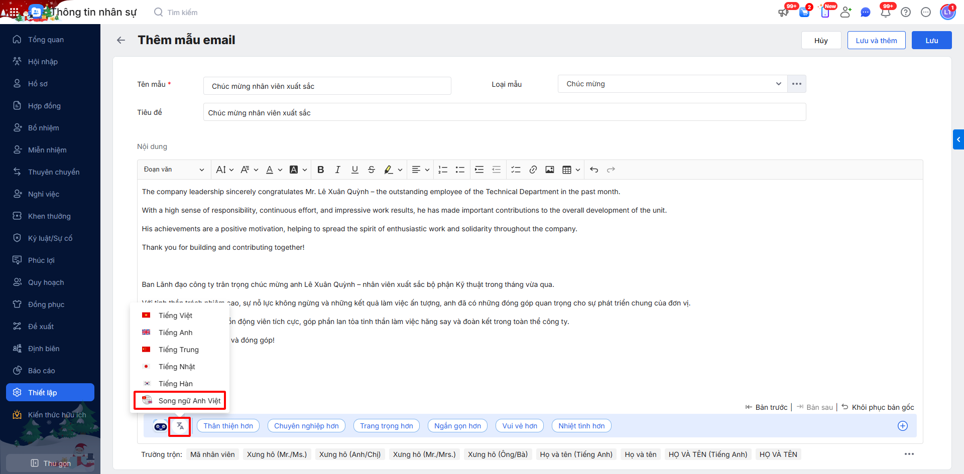 Bài viết hướng dẫn cách tạo email song ngữ (Việt – Anh) tự động bằng trợ lý ảo AVA trên nền tảng MISA. Nội dung bao gồm các bước thiết lập mẫu email, sử dụng tính năng dịch tự động và lưu mẫu. Áp dụng cho người dùng cần gửi email đa ngôn ngữ trong quản trị nhân sự.