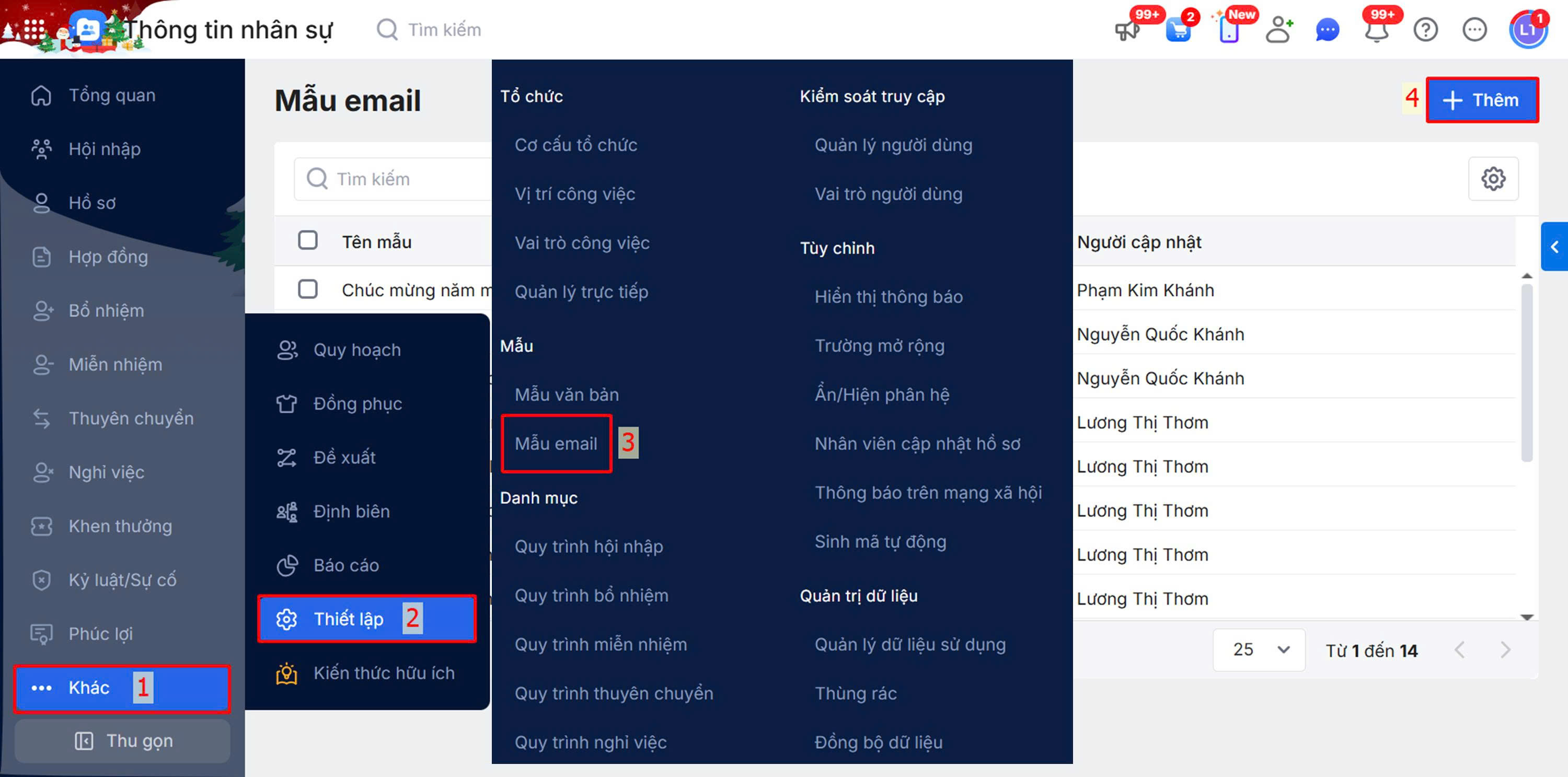 Bước 1: Vào mục Khác \ tại phân hệ Thiết lập \ chọn Mẫu email \ sau đó nhấn Thêm.