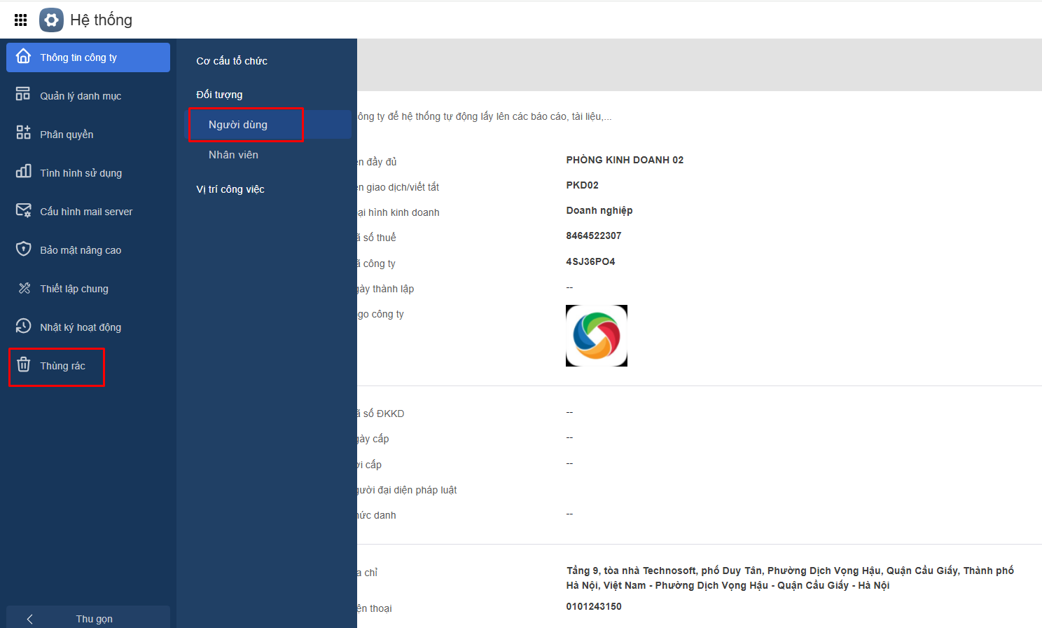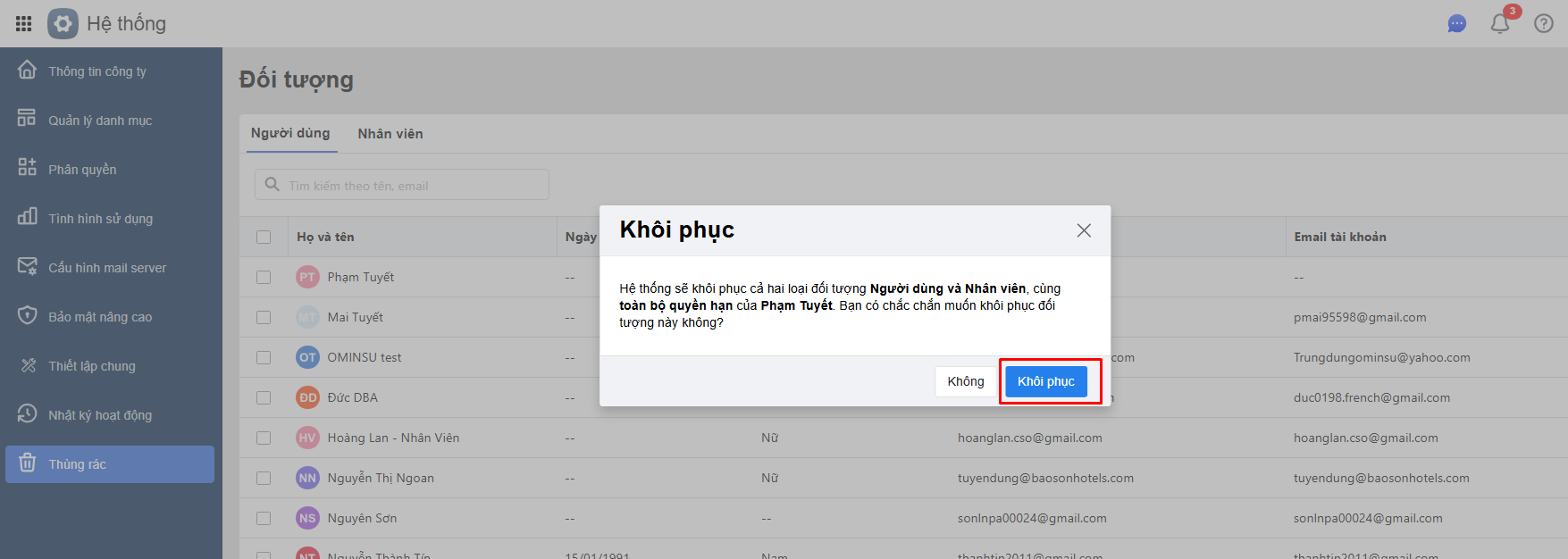 Khi thêm một người dùng trong hệ thống, nếu phần mềm báo đã tồn tại bản ghi trùng hoặc muốn khôi phục lại người dùng đã xóa. Cần tiến hành khôi phục lại người dùng từ thùng rác hệ thống: