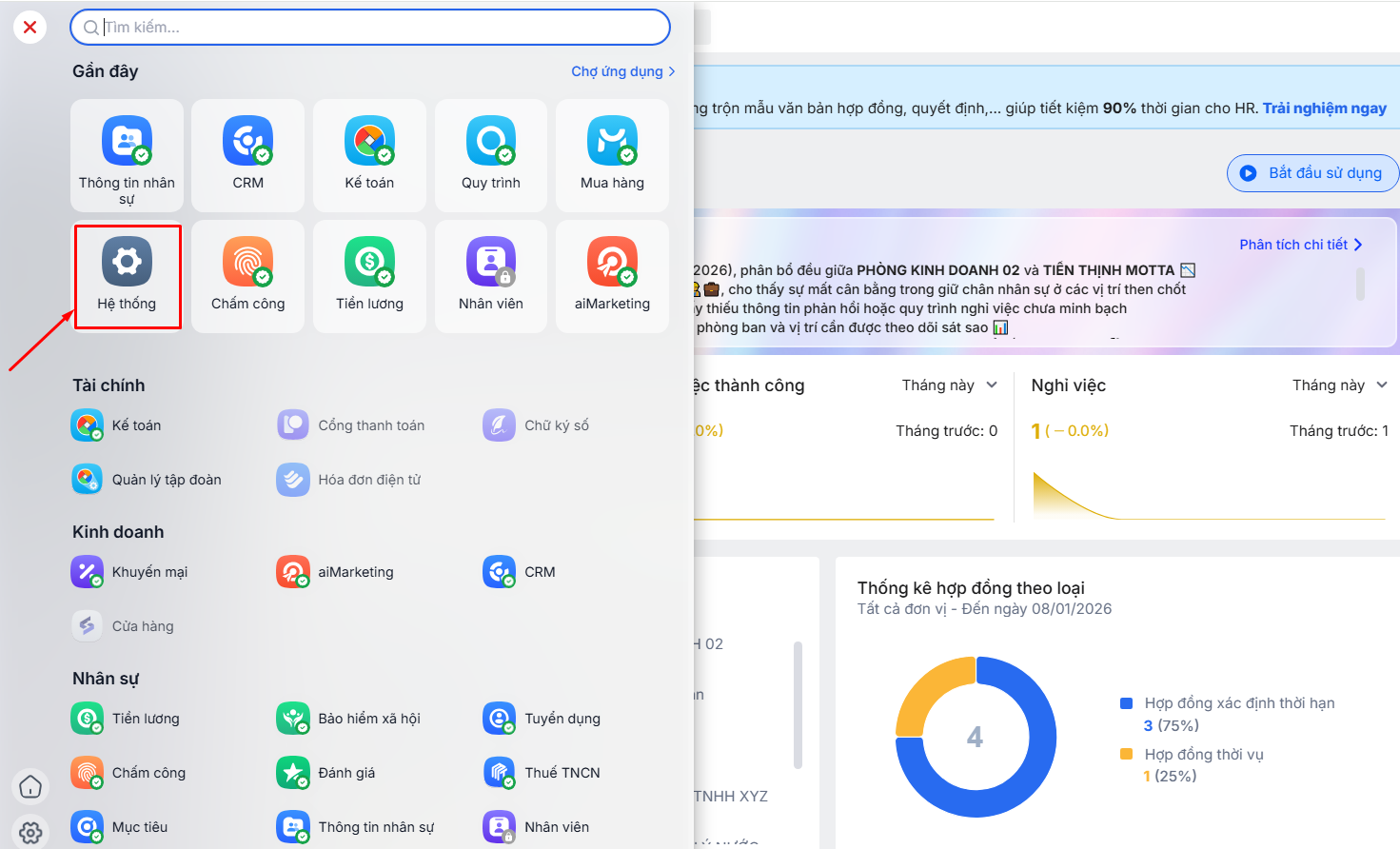 Bước 1: Truy cập vào hệ thống bằng cách nhấn vào biểu tượng 9 chấm góc trái màn hình\ Chọn Hệ thống.