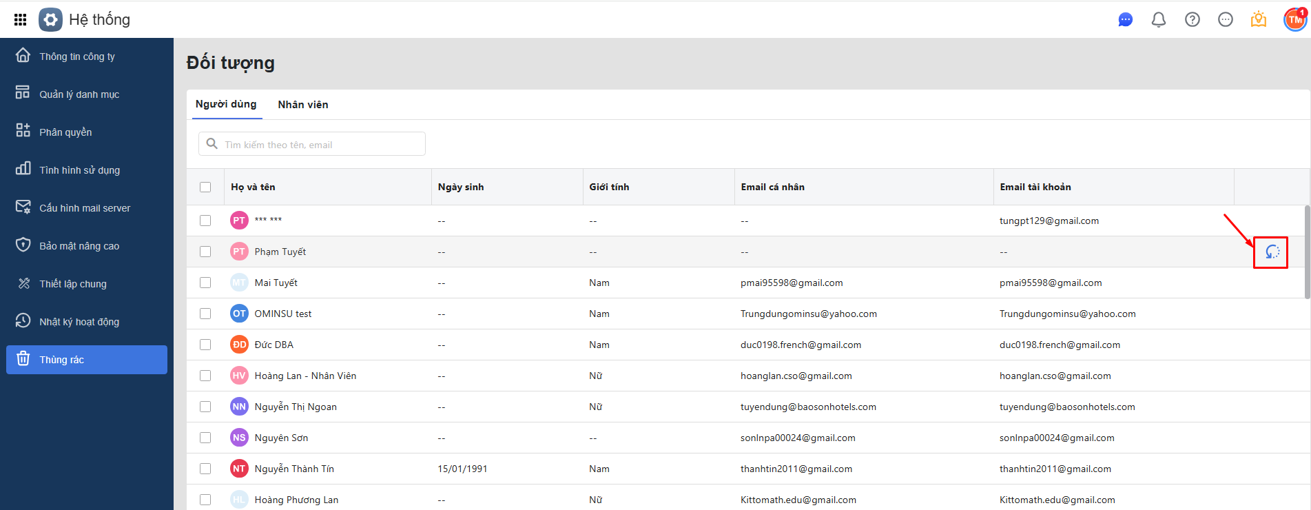 Bước 3: Di chuột vào từng bản ghi người dùng hoặc tích chọn người người dùng\ Chọn biểu tượng mũi tên quay tròn để khôi phục lại người dùng về trạng thái trước xóa trong danh mục người dùng.