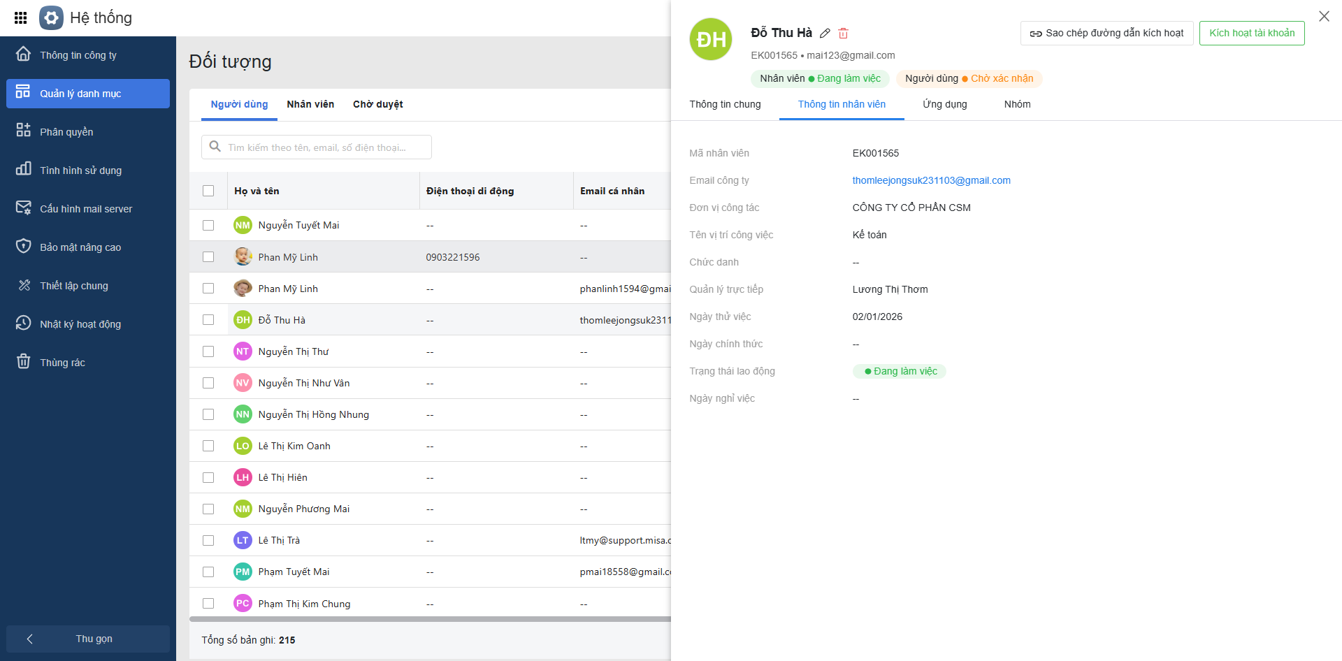 - Nếu “Người dùng” mới được thêm vào có “Số điện thoại” chưa kích hoạt MISA ID thì “Người dùng” sẽ ở trạng thái Chờ xác nhận và nhận được email hướng dẫn kích hoạt.