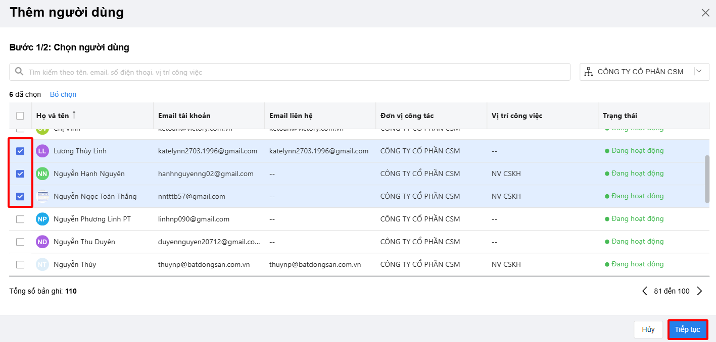 Bước 3: Trên danh sách Người dùng, tích chọn những người dùng muốn thêm, sau đó nhấn Tiếp tục