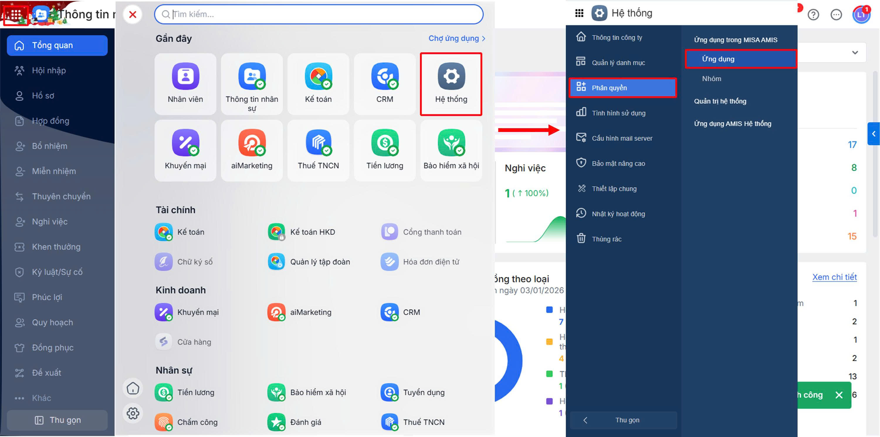 Bước 1: Click vào biểu tượng 9 chấm \ chọn Hệ thống \ mục Phân quyền \ chọn phân hệ Ứng dụng