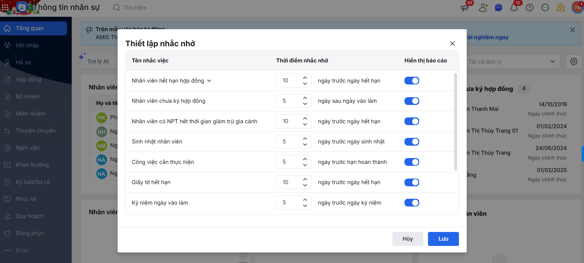 - Sinh nhật nhân viên: Chương trình lấy dữ liệu từ hồ sơ nhân viên (trạng thái lao động là Đang làm việc) có ngày sinh thuộc khoảng: Ngày hiên hiện tại ≤ Ngày sinh ≤ (Ngày hiện tại + Số ngày nhắc việc)