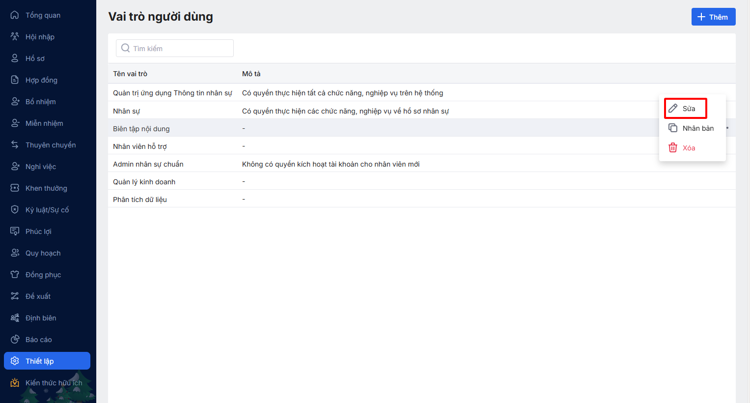 Bước 1: Tại phần mềm thông tin nhân sự, truy cập vào phân hệ Thiết lập\Vai trò người dùng