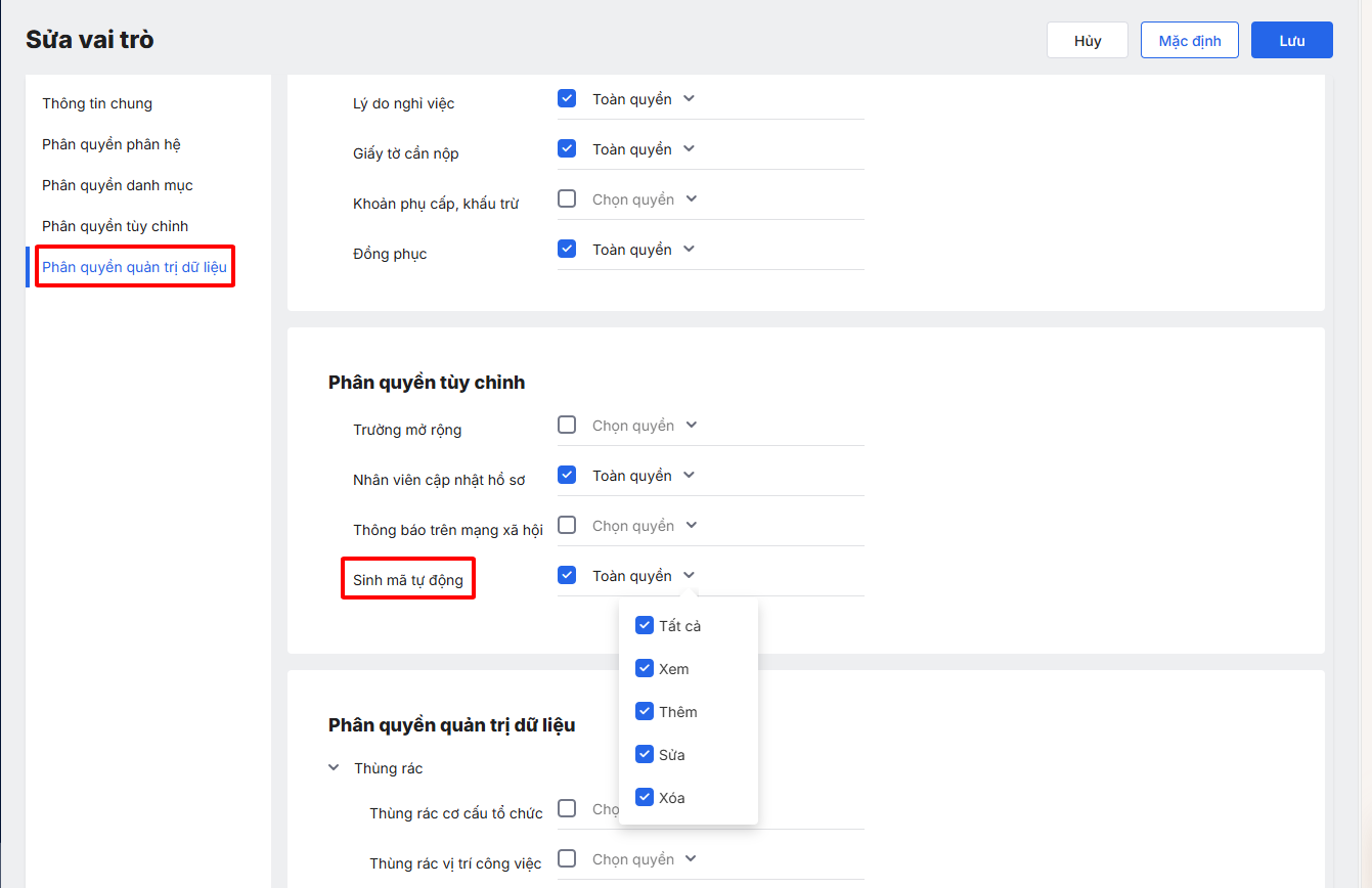- Riêng vai trò Nhân sự và Quản trị ứng dụng mặc định có quyền xem/thêm/sửa/xóa quy tắc sinh mã tự động.