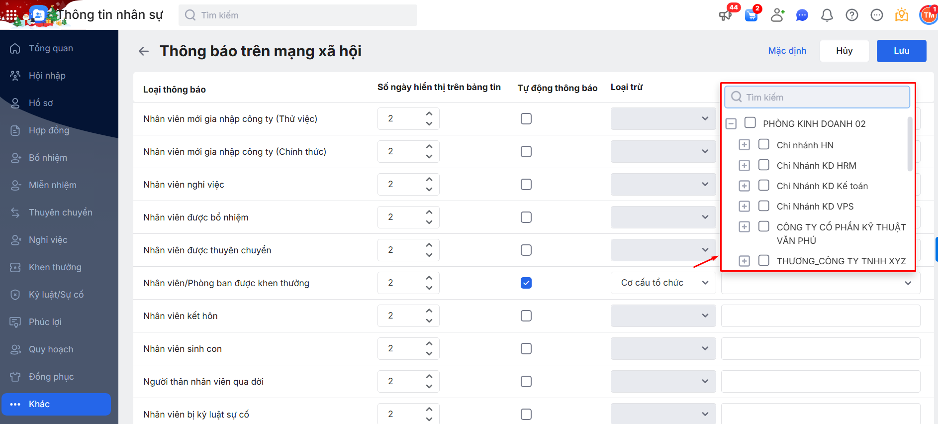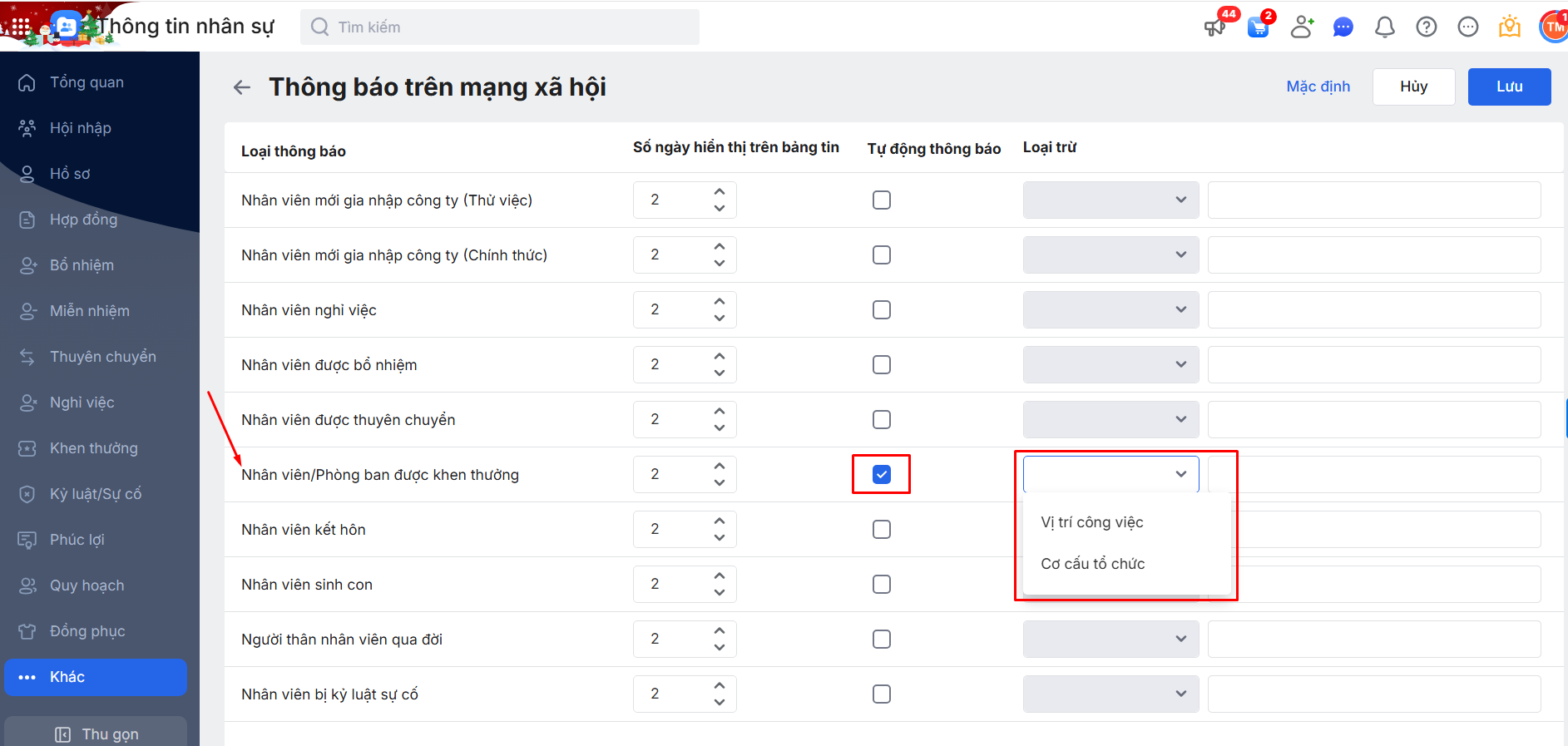 Bước 4: Tại mục Nhân viên\Phòng ban được khen thưởng\ Tích chọn tự động thông báo\ Thiết lập số ngày hiển thị, Loại trừ hiển thị theo Vị trí công việc và Cơ cấu tổ chức (nếu có).