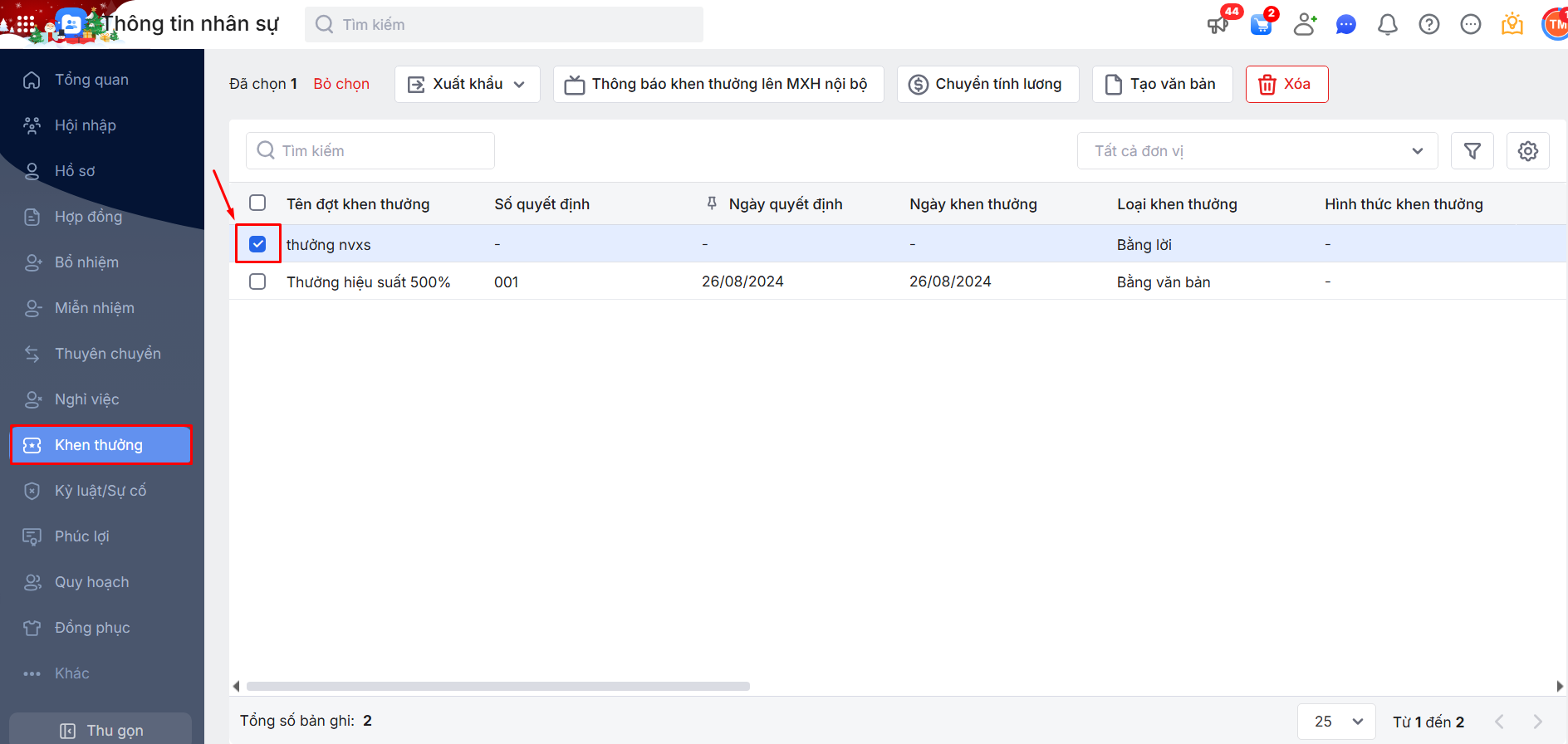 Bước 1: Truy cập vào phân hệ Khen thưởng\ Tích chọn các Đợt khen thưởng muốn thông báo lên MXH nội bộ.