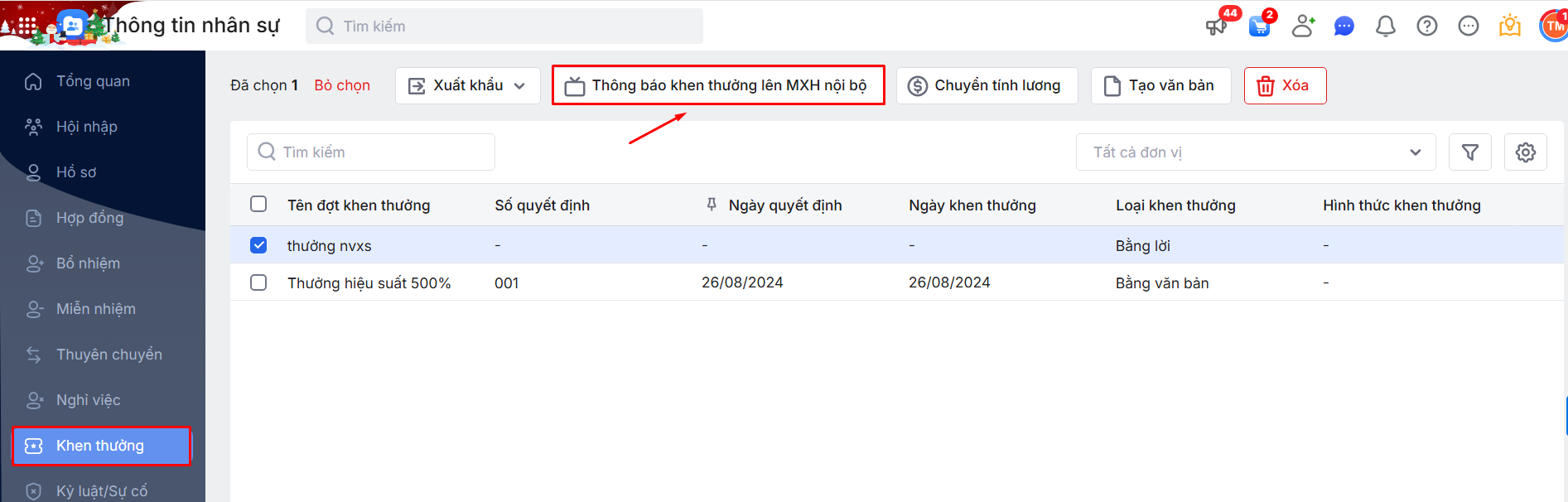 Bước 2: Nhấn “Thông báo khen thưởng lên MXH nội bộ“.
