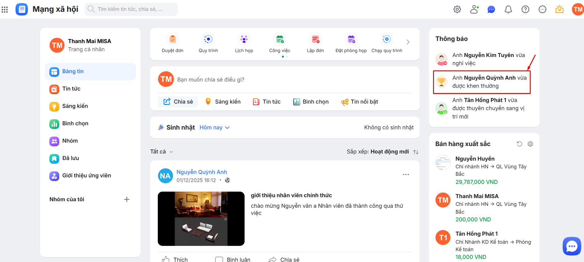 Bước 3: Trên AMIS Mạng xã hội sẽ hiển thị thông báo HR vừa xuất.