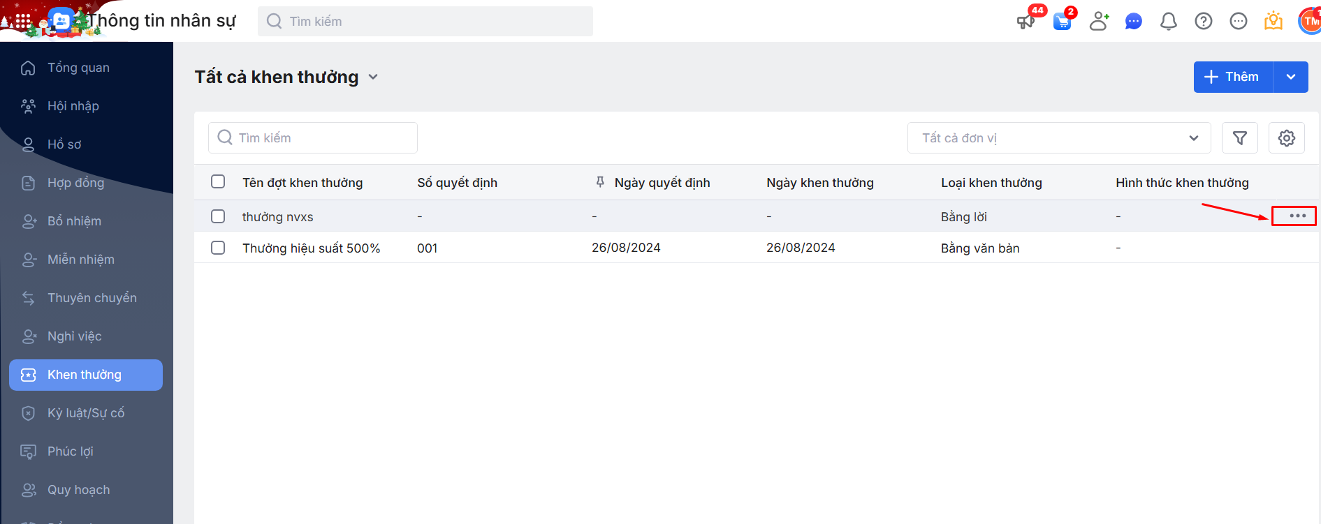 Bước 1: Tại danh sách Đợt khen thưởng\ Đối với những khen thưởng đã thông báo lên MXH\ Di chuột vào Đợt Khen thưởng\ Nhấn chọn biểu tượng dấu ba chấm.