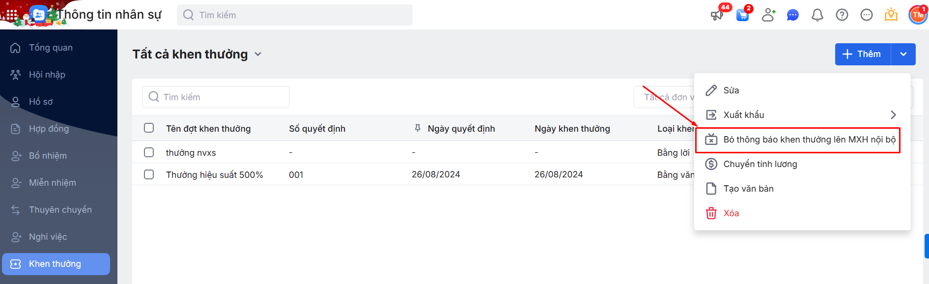 Bước 2: Nhấn chọn chức năng Bỏ thông báo khen thưởng lên MXH nội bộ.