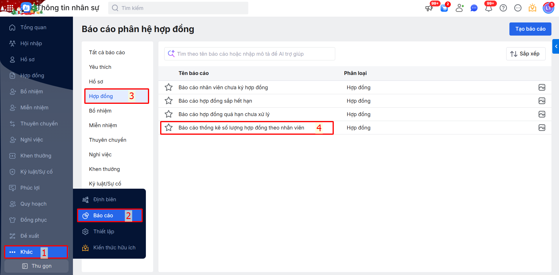 Bước 1: Vào mục Khác \ phân hệ Báo cáo \ chọn trường Hợp đồng \ sau đó nhấn vào Báo cáo thống kê số lượng hợp đồng theo nhân viên