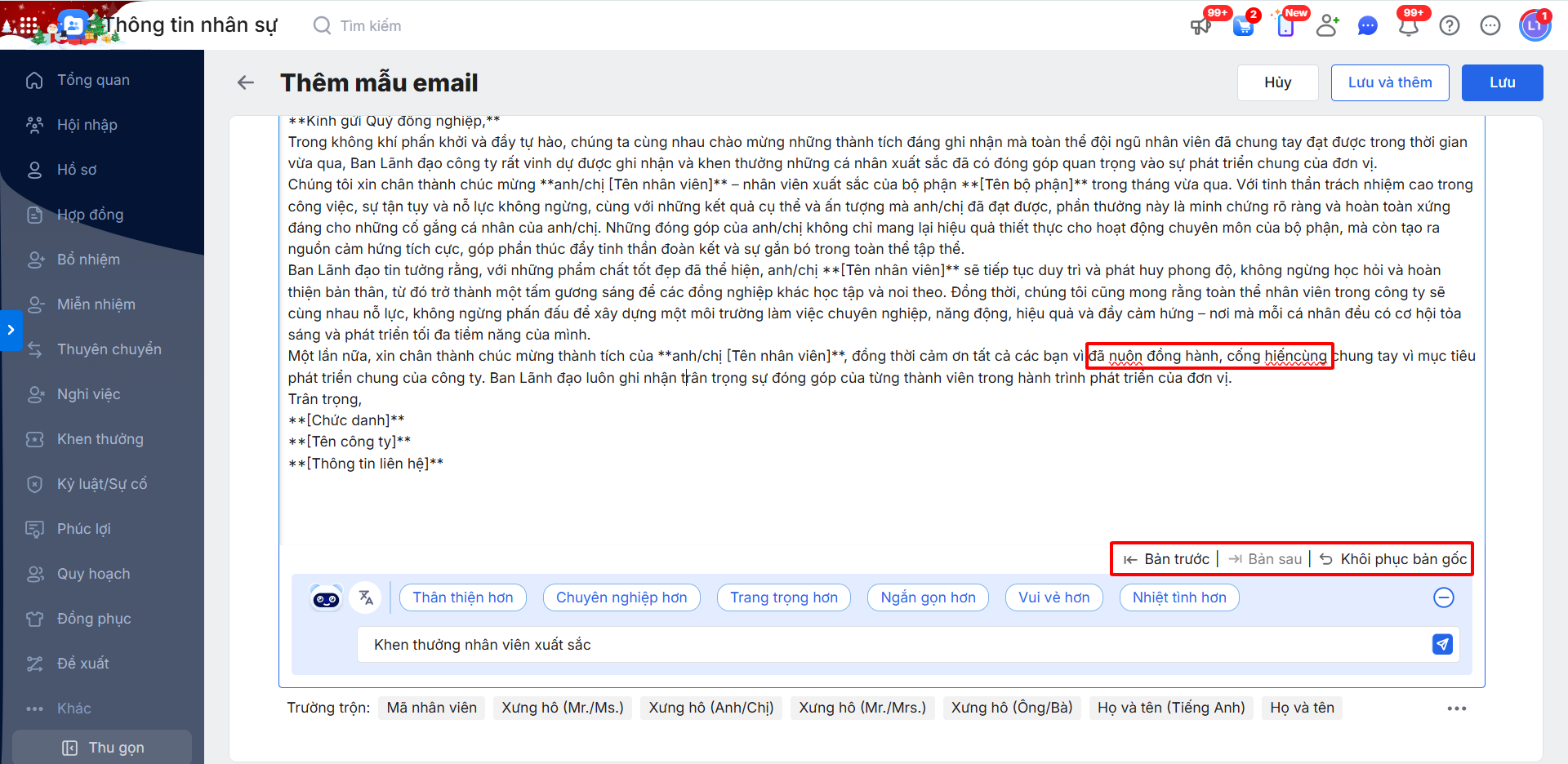 Bước 3: Sau khi trợ lý AI MISA AVA tạo nội dung, HR kiểm tra lại và có thể yêu cầu sửa nội dung theo các phong cách gợi ý sẵn hoặc tự nhập yêu cầu cho AVA tinh chỉnh phù hợp hơn.