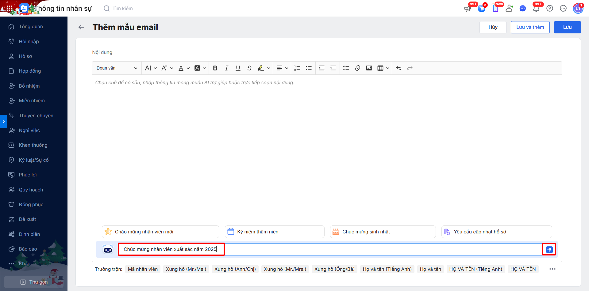 Tích hợp AI để sáng tạo nội dung email gửi cho nhân viên (chào mừng nhân viên mới, chúc mừng sinh nhật,…)