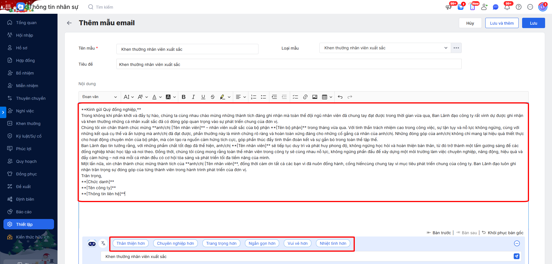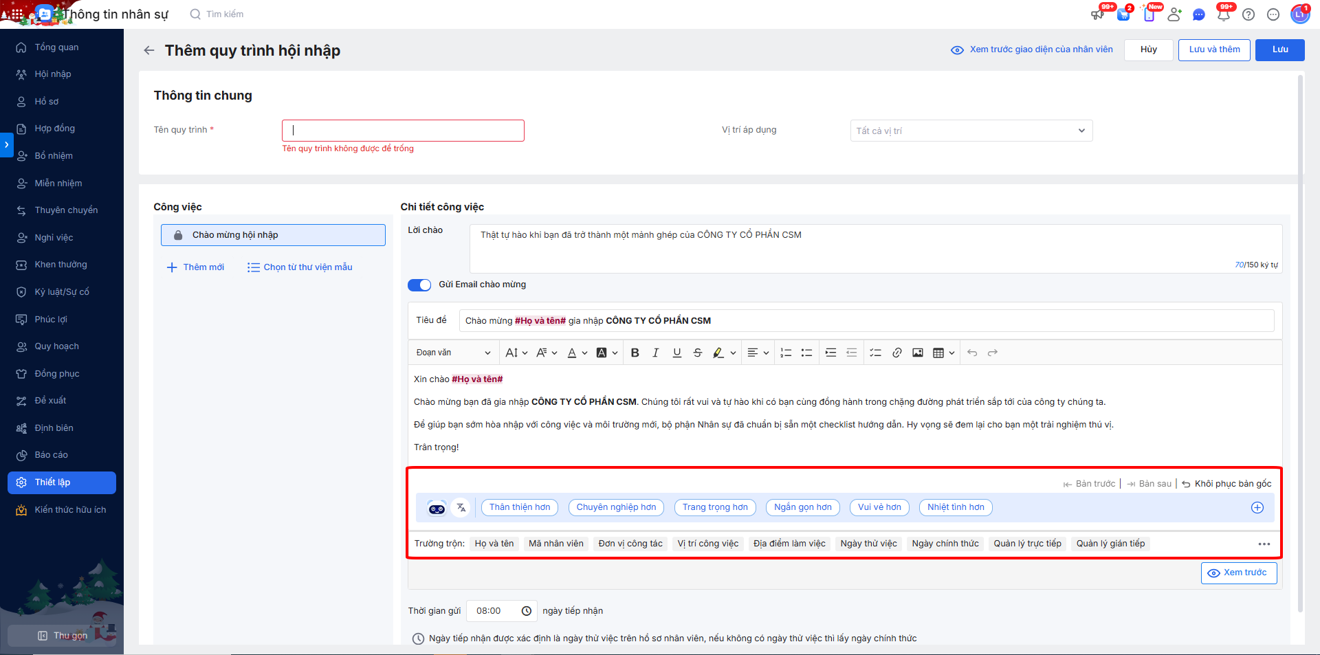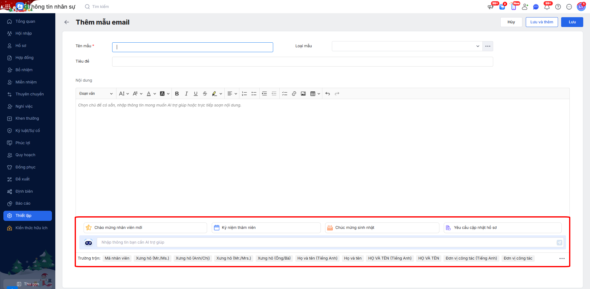 Phạm vi áp dụng: các giao diện Mẫu email, Quy trình hội nhậpGửi email từ hồ sơ nhân viên.