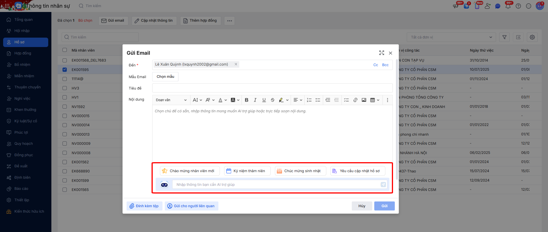 • Gửi email từ hồ sơ nhân viên: Phân hệ Hồ sơ \ tích một hoặc nhiều bản ghi \ nhấn Gửi email