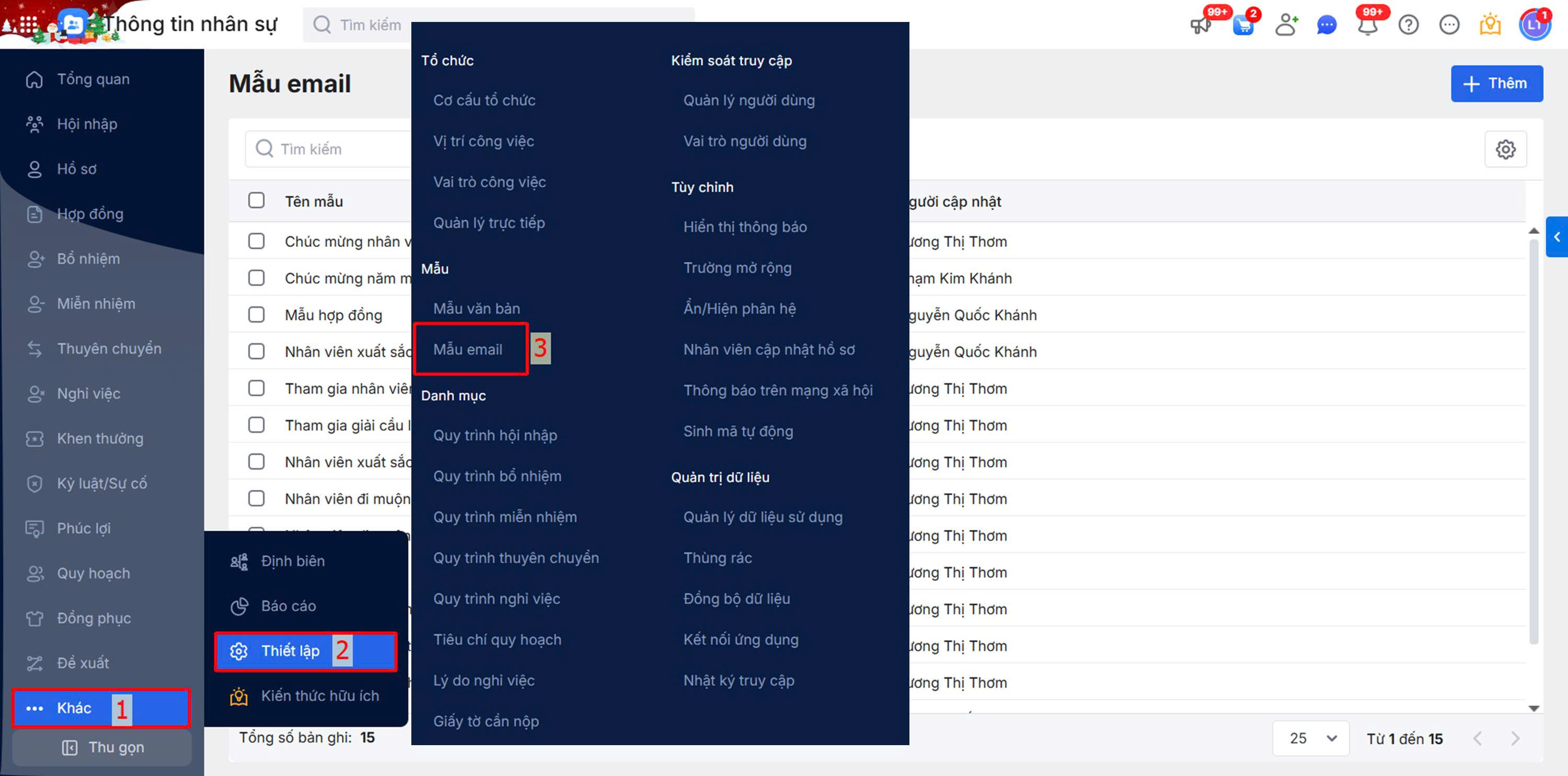 • Mẫu email: Mục Khác \ chọn phân hệ Thiết lập \ Mẫu \ chọn Mẫu email để truy cập vào giao diện Mẫu email