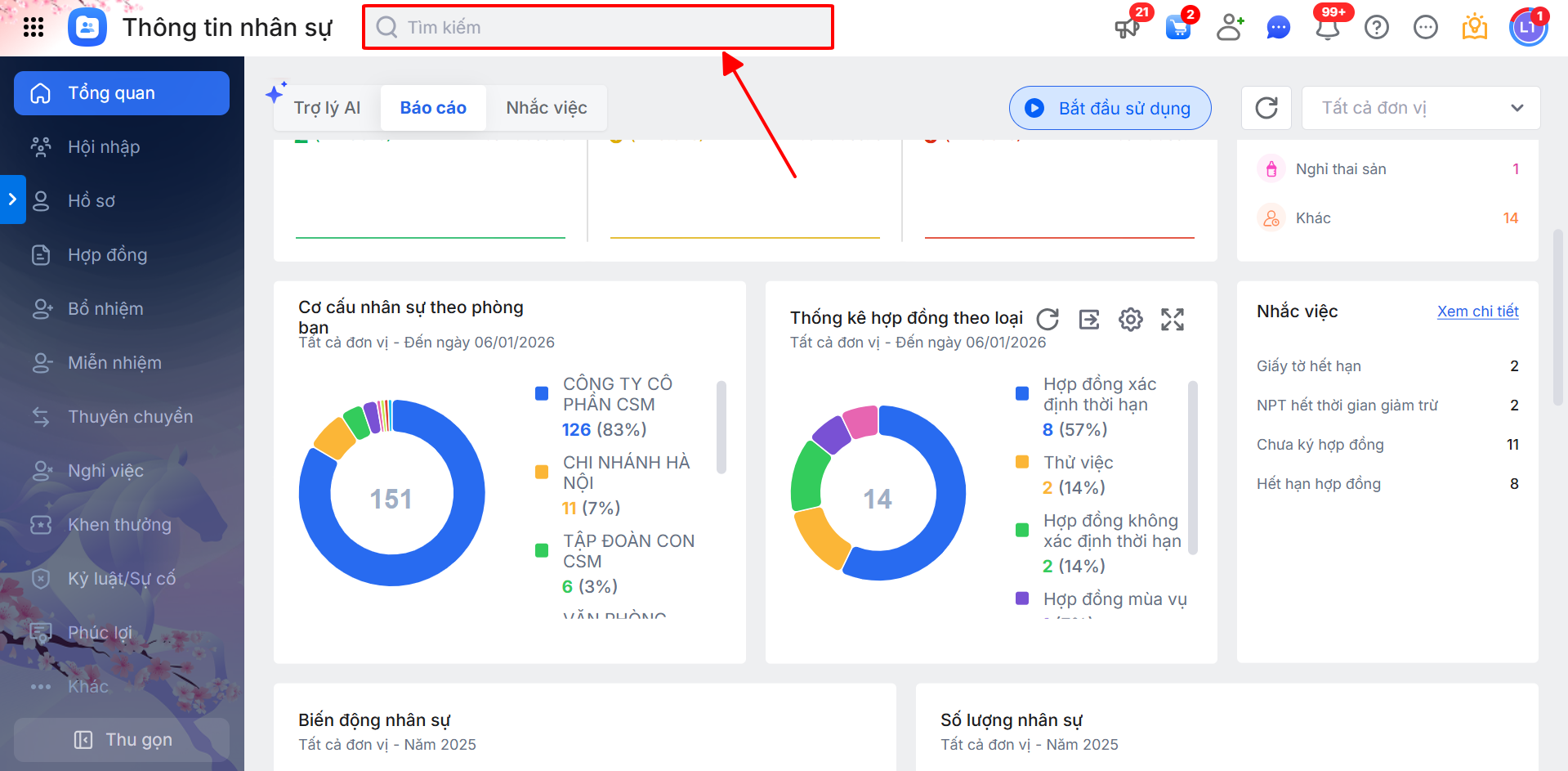 Trên giao diện phần mềm, nhấn Tìm kiếm ở phía trên để tìm nhanh tất cả thông tin mà không cần truy cập vào từng phân hệ.