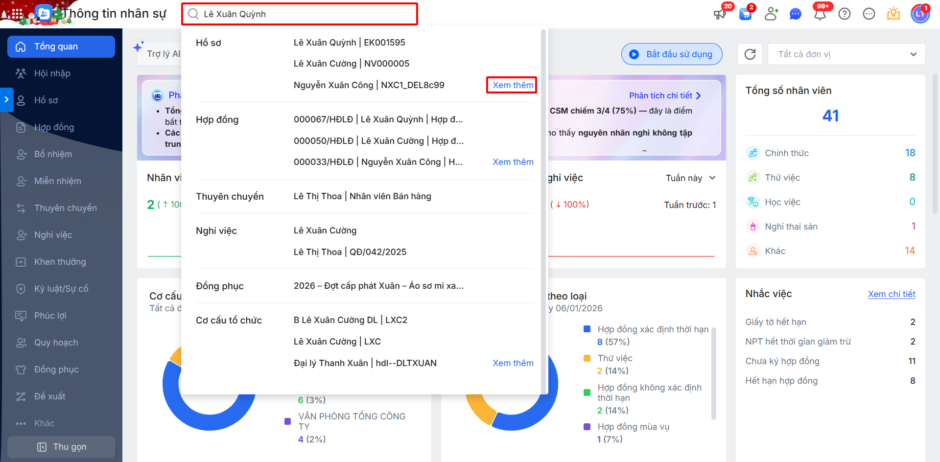 Bước 2: Nhập thông tin cần tìm kiếm \ sau đó nhấn Enter \ phần mềm sẽ hiển thị danh sách các kết quả tìm kiếm đang nằm ở những phân hệ nào \ có thể chọn Xem thêm để xem chi tiết các thông tin tìm được.
